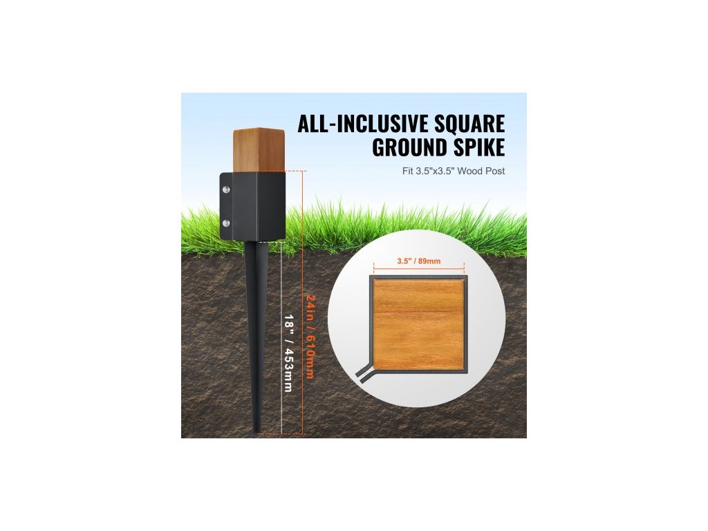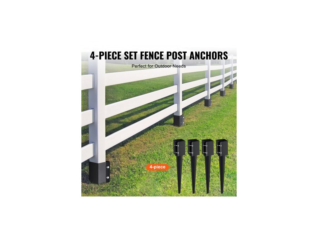 Kotevní zemní kolík na plotové sloupky, balení 4 kusů, vnější průměr 24 x 4 x 4 palce (vnitřní průměr 3,5 x 3,5 palce), kovový černý práškově lakovaný zemní kolík, pro zábradlí poštovní schránky na zahradní terasu