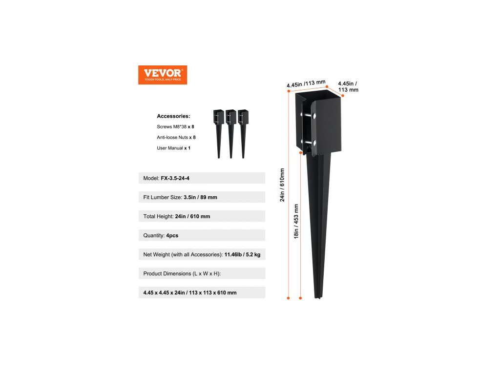 Model: FX-3.5-24-4,Vhodná velikost řeziva: 3,5 palce / 89 mm,Množství: 4 ks,Rozměry výrobku (D x Š x V): 4,45 x 4,45 x 24 palců / 113 x 113 x 610 mm,Čistá hmotnost (s příslušenstvím): 11,46 lb / 5,2 kg,Délka hřebíků: 18 palců / 453 mm ±10 mm,Tloušťka materiálu: Hřebíková deska: 1,7 mm,Sloupek Upevňovací deska: 1,7 mm, ±0,1, Hlavní materiál: Ocel, Celková výška: 610 mm