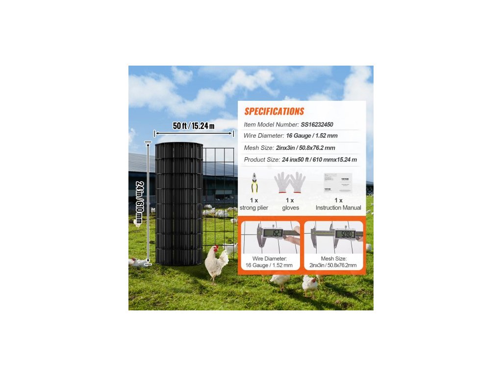 Číslo modelu položky: SS16232450, Čistá hmotnost výrobku: 3 kg ±3 %, Povrchová úprava: Pozink + černý vinyl, Velikost ok: 2 x 3 palce/50,8 x 76,2 mm, Hlavní materiál: Pozinkovaný železný drát + PVC, Průměr drátu: 16 Gauge/1,52 mm, Velikost výrobku: 24 palců x 50 stop/610 x 15240 mm