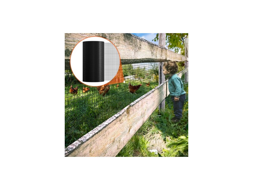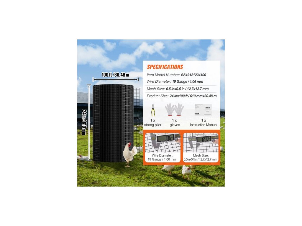 Číslo modelu položky: SS19121224100, Čistá hmotnost výrobku: 11,3 kg ±3 %, Povrchová úprava: Pozink + černý vinyl, Velikost ok: 0,5 palce x 0,5 palce/12,7 x 12,7 mm, Hlavní materiál: Pozinkovaný železný drát + PVC, Průměr drátu: 19 gauge (po povlaku) /1,06 mm, Velikost výrobku: 24 palce x 100 stop/610 x 30480 mm