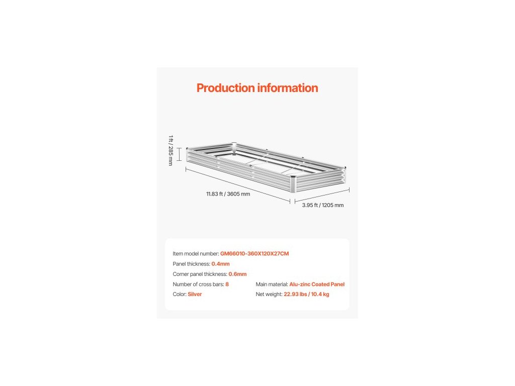 Kovový vyvýšený záhon , venkovní pozinkovaný květináč o rozměrech 3,6 x 1,2 x 30 cm, s otevřeným dnem, velký vyvýšený záhon pro pěstování zeleniny, květin, bylin a sukulentů, stříbrný
