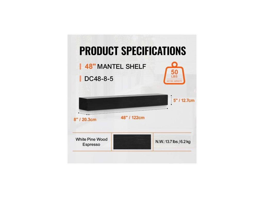 Krbová římsa , 122 cm x 20 cm x 13 cm, nosnost 22,5 kg, římsa z přírodního dřeva pro nadkrb, nástěnná plovoucí farmářská police, ručně vyrobená krbová římsa pro nástěnnou dekoraci, espresso
