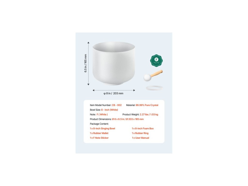 Poznámka: F, Číslo modelu položky: CB-002, Hmotnost výrobku: 2,27 lbs / 1,03 kg, Materiál: 99,99% čistý křišťál, Rozměry výrobku: 8 x 8 x 6,5 palce / 203 x 203 x 165 mm, Velikost mísy: 8 palců