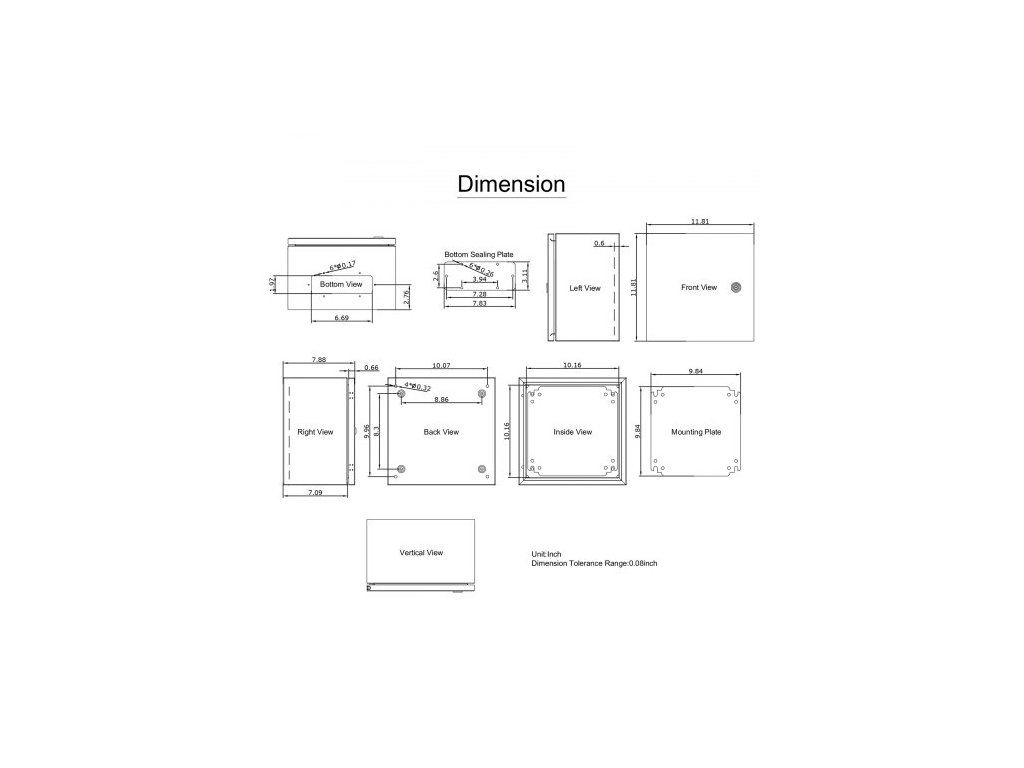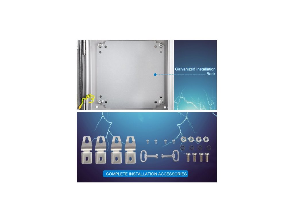 Rozměry (V x Š x H): 12 x 12 x 8"/300 x 300 x 200 mm,Montážní deska: 2 mm/0,079'' odnímatelná pozinkovaná zadní deska,Krytí IP: IP66,Model: SP-B3 303020,Materiál: 1,5 mm/0,059'' nerezová ocel 304,Typ montáže: Nástěnná montáž,Čistá hmotnost: 6,3 kg/13,89 lbs, Použití: Vnitřní/Venkovní, Hodnocení NEMA: NEMA 4X