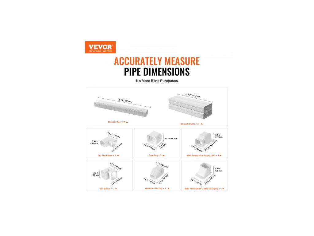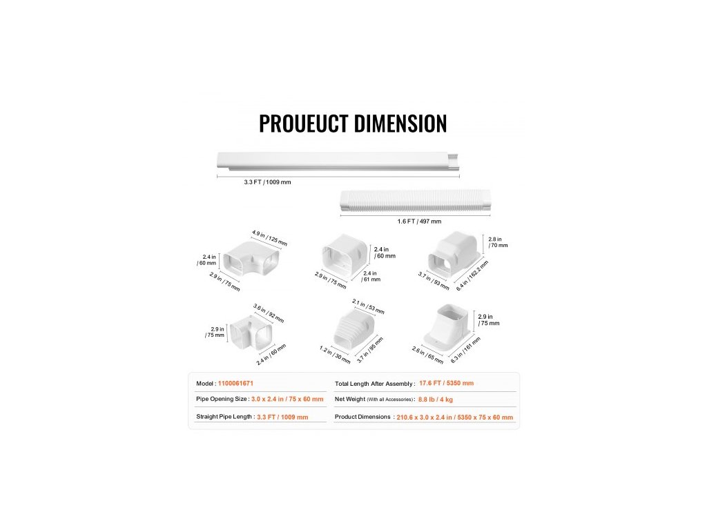 Délka rovného potrubí: 3,3 FT / 1009 mm, Celková délka po montáži: 17,6 FT / 5350 mm, Model: 1100061671, Velikost otvoru potrubí: 3,0x2,4 palce / 75x60 mm, Rozměry výrobku (D x Š x V): 210,6x3,0x2,4 palce / 5350x75x60 mm, Čistá hmotnost (se vším příslušenstvím): 8,8 lb / 4 kg