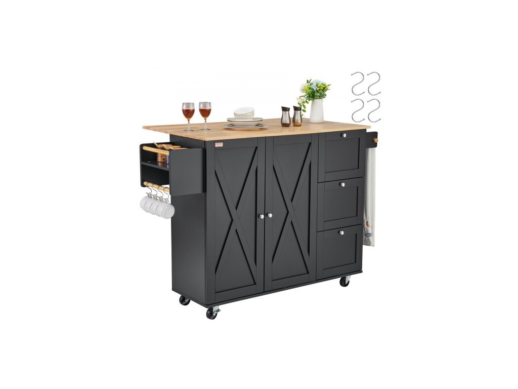 Kuchyňský ostrůvek , mobilní vozíky s dřevěnou deskou 56" s úložnou skříňkou, pojízdným stolem s výklopnou deskou, věšákem na koření, věšákem na ručníky, nastavitelnou policí, zásuvkou a háčky, přenosné ostrůvky na kolečkách, černýMultifunkční kuchyňský ostrůvek