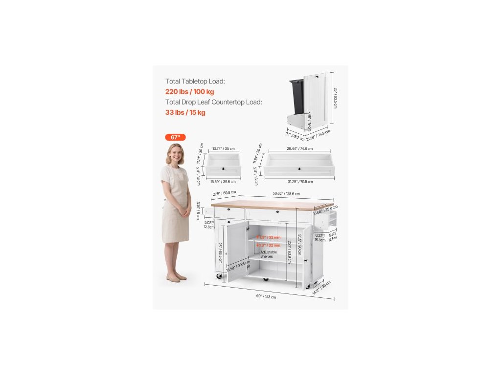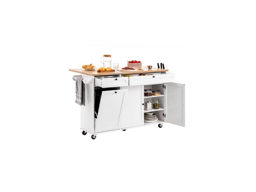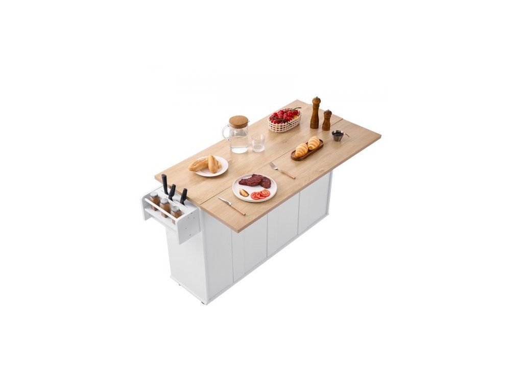 Kuchyňský ostrůvek s úložným prostorem, mobilní kuchyňský vozík o šířce 153 cm s kolečky, výklopnou deskou, 2 zásuvkami, skříňkou na odpadkový koš, držákem na nože, věšákem na koření a věšákem na ručníky, stůl do jídelny, spíž