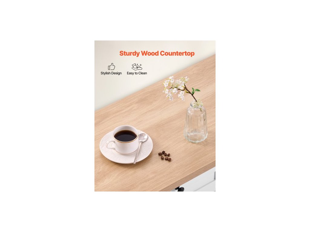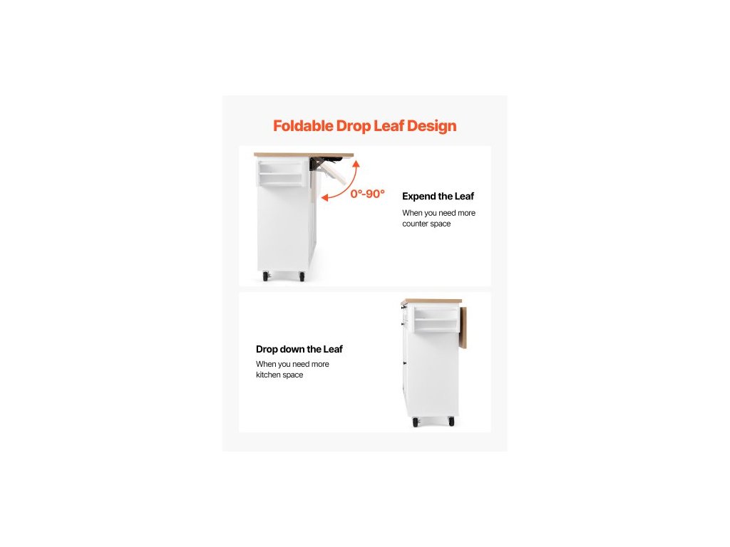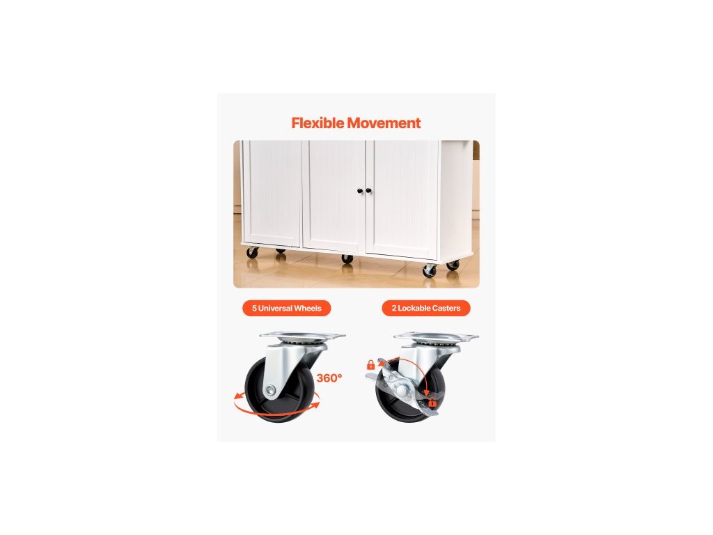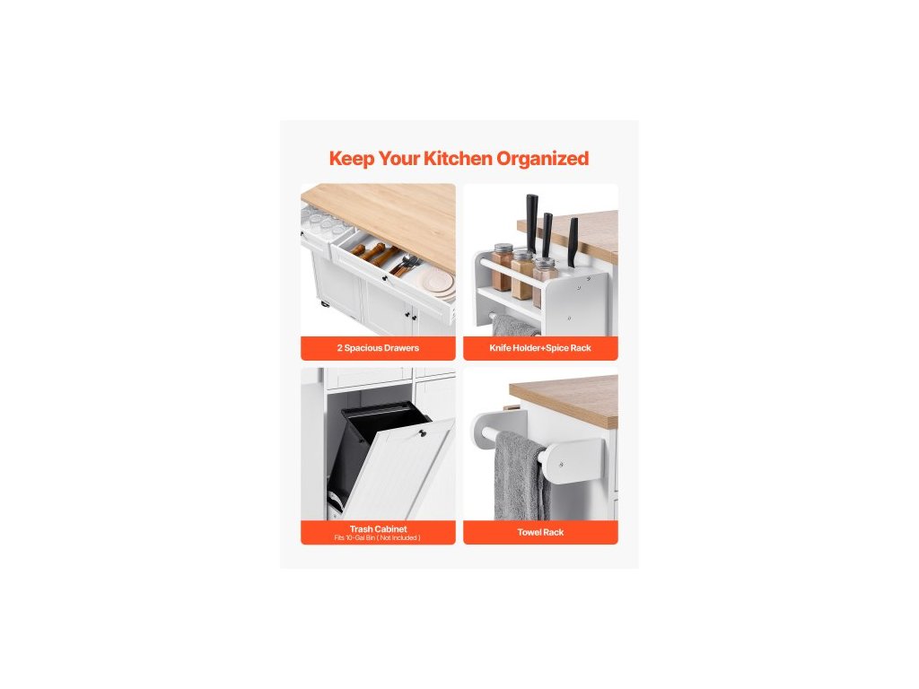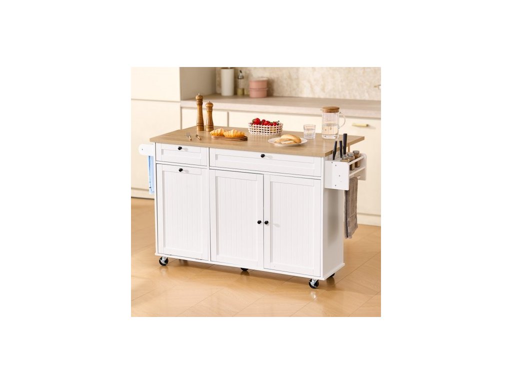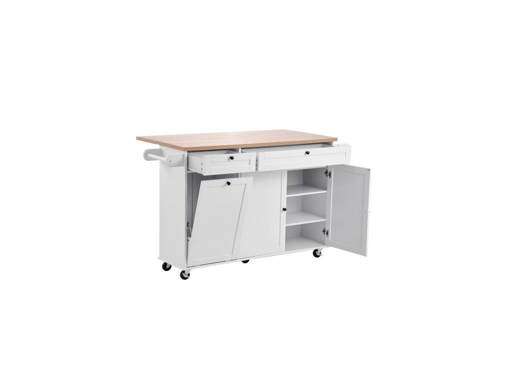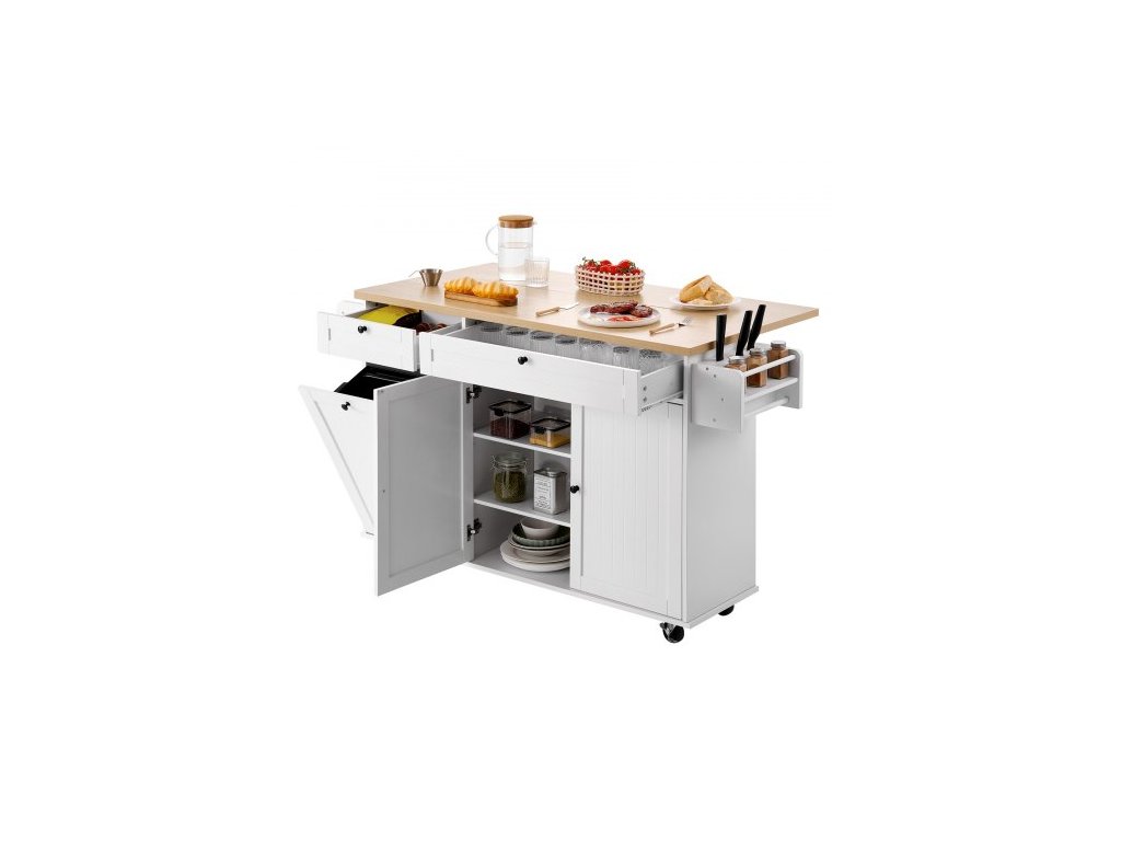 Kuchyňský ostrůvek s úložným prostorem, mobilní kuchyňský vozík o šířce 153 cm s kolečky, výklopnou deskou, 2 zásuvkami, skříňkou na odpadkový koš, držákem na nože, věšákem na koření a věšákem na ručníky, stůl do jídelny, spížHladce vysouvací zásuvka