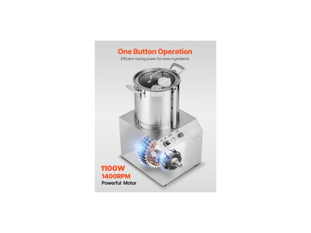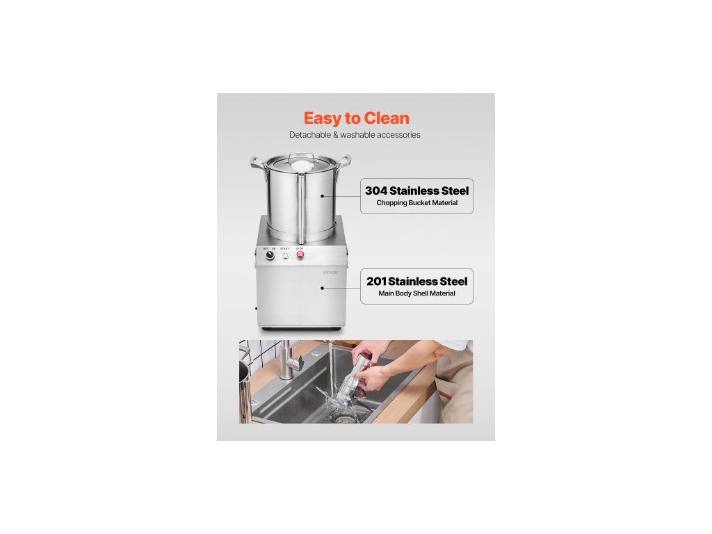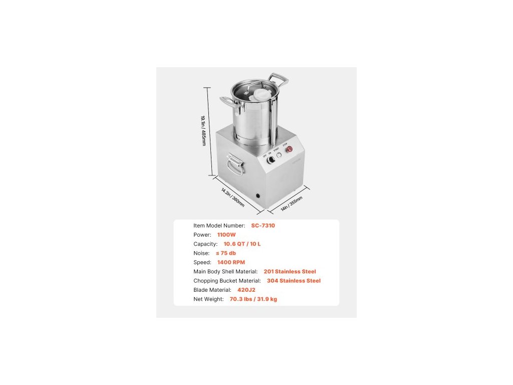 Materiál nožů: 420J2, Rychlost: 1400 ot./min, Kapacita: 10,6 QT / 10 l, Hluk: ≤ 75 db, Materiál sekací nádoby: Nerezová ocel 304, Číslo modelu položky: SC-7310, Materiál pláště hlavního tělesa: Nerezová ocel 201, Čistá hmotnost: 68,4 lbs / 31,0 kg, Příkon: 1100 W, Rozměry výrobku: 14,2 x 14 x 22,2 palce / 360 x 355 x 565 mm