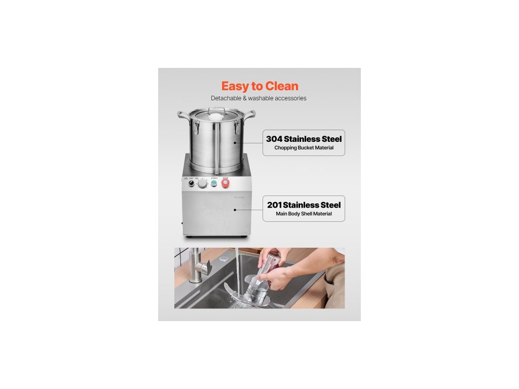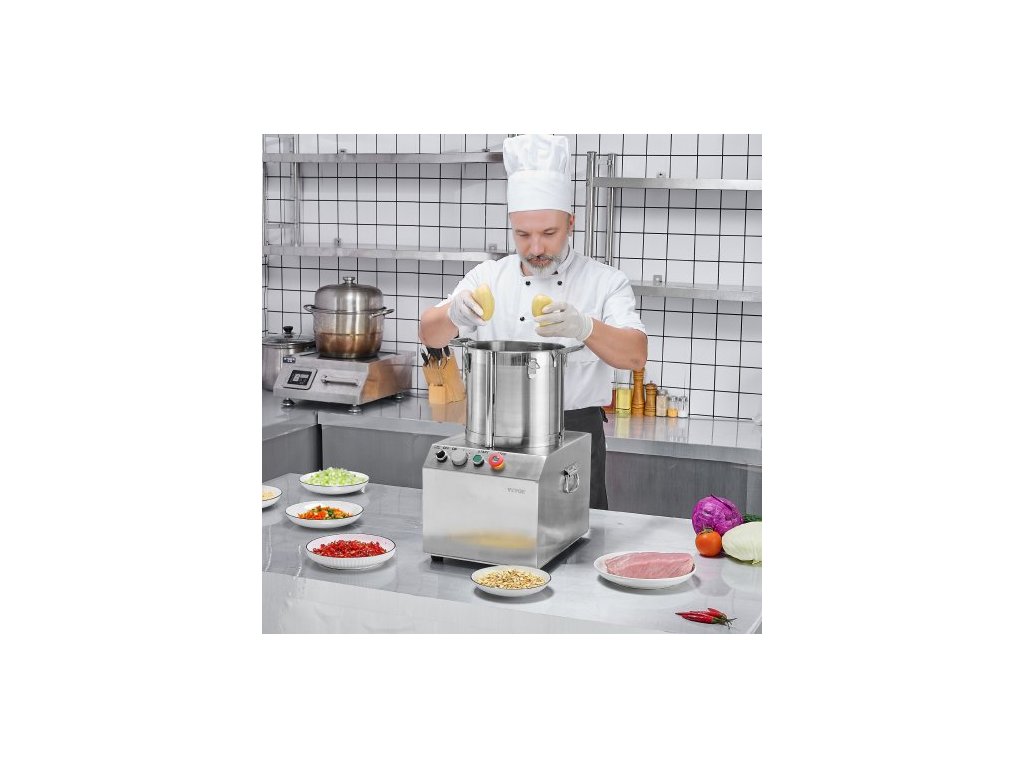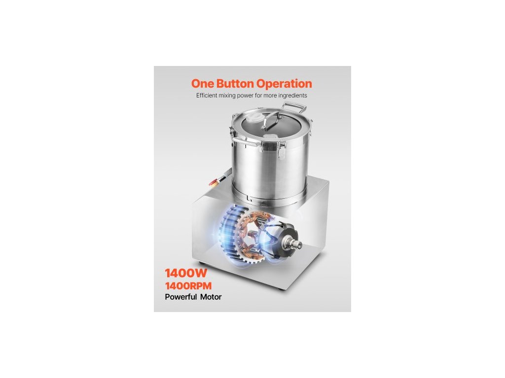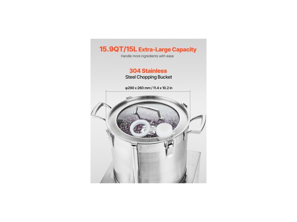 Materiál nožů: 420J2,Otáčky: 1400 ot./min,Objem: 15,9 QT / 15 l,Hlučnost: ≤ 75 db,Materiál sekací nádoby: nerezová ocel 304,Číslo modelu: SC-7315,Materiál pláště hlavního tělesa: nerezová ocel 201,Čistá hmotnost: 75 lbs / 34,0 kg,Příkon: 1400 W,Rozměry výrobku: 15,7 x 15,9 x 24 palců / 400 x 405 x 610 mm