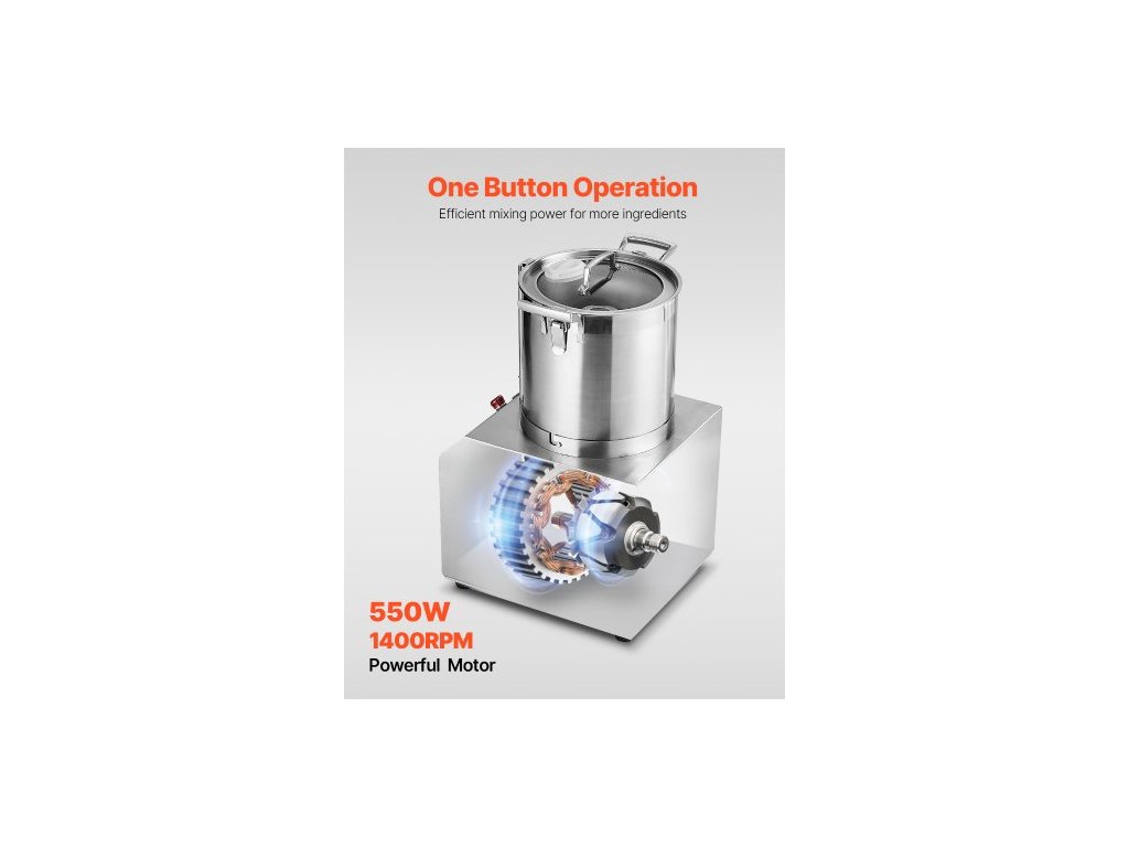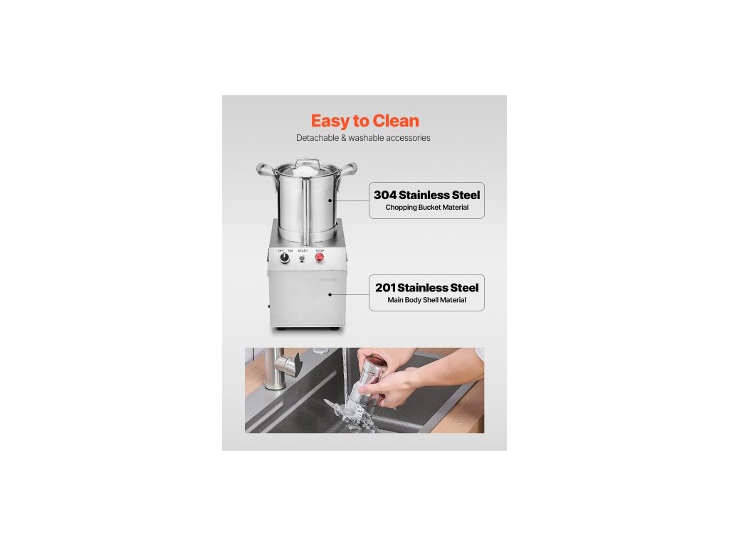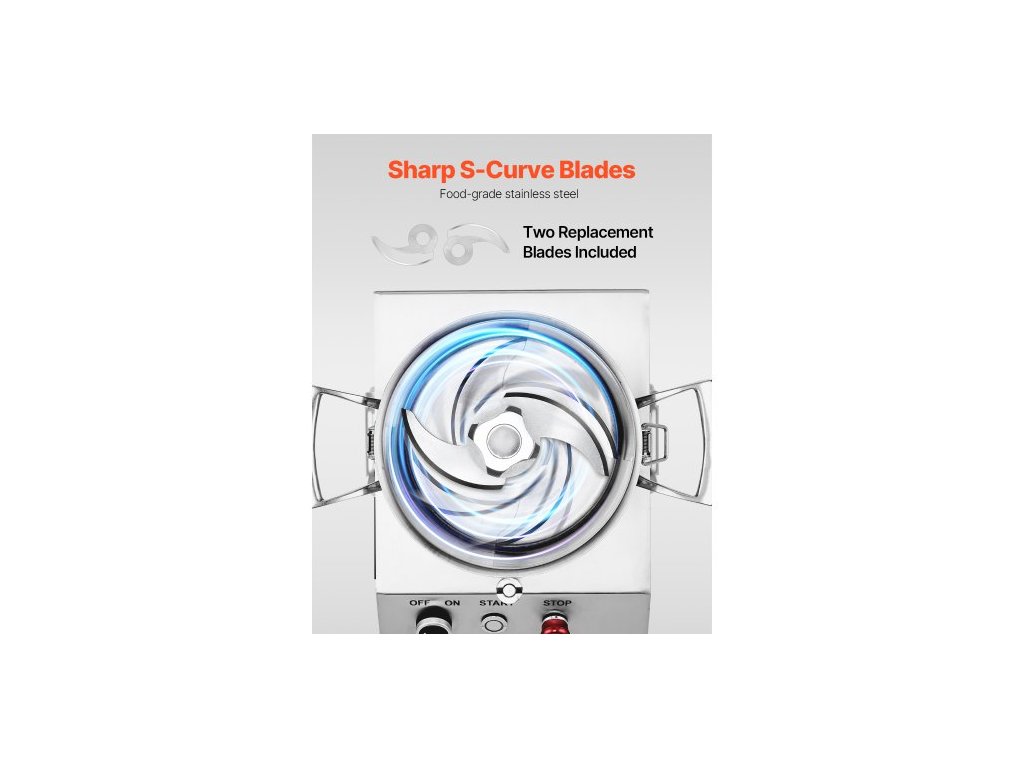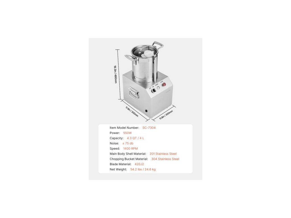 Materiál nožů: 420J2,Otáčky: 1400 ot./min,Objem: 4,3 QT / 4 l,Hlučnost: ≤ 75 db,Materiál sekací nádoby: nerezová ocel 304,Číslo modelu: SC-7304,Materiál pláště hlavního tělesa: nerezová ocel 201,Čistá hmotnost: 52,5 lbs / 23,8 kg,Příkon: 550 W,Rozměry výrobku: 11,8 x 11,8 x 18,7 palců / 300 x 300 x 475 mm