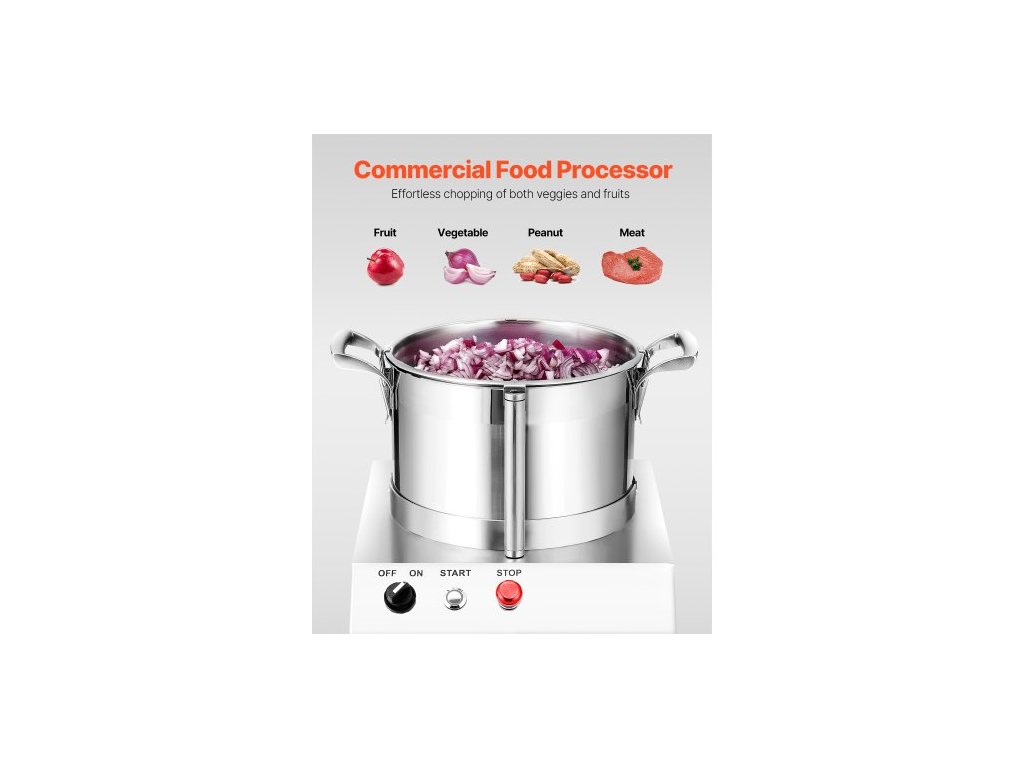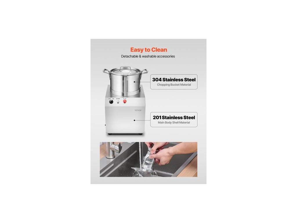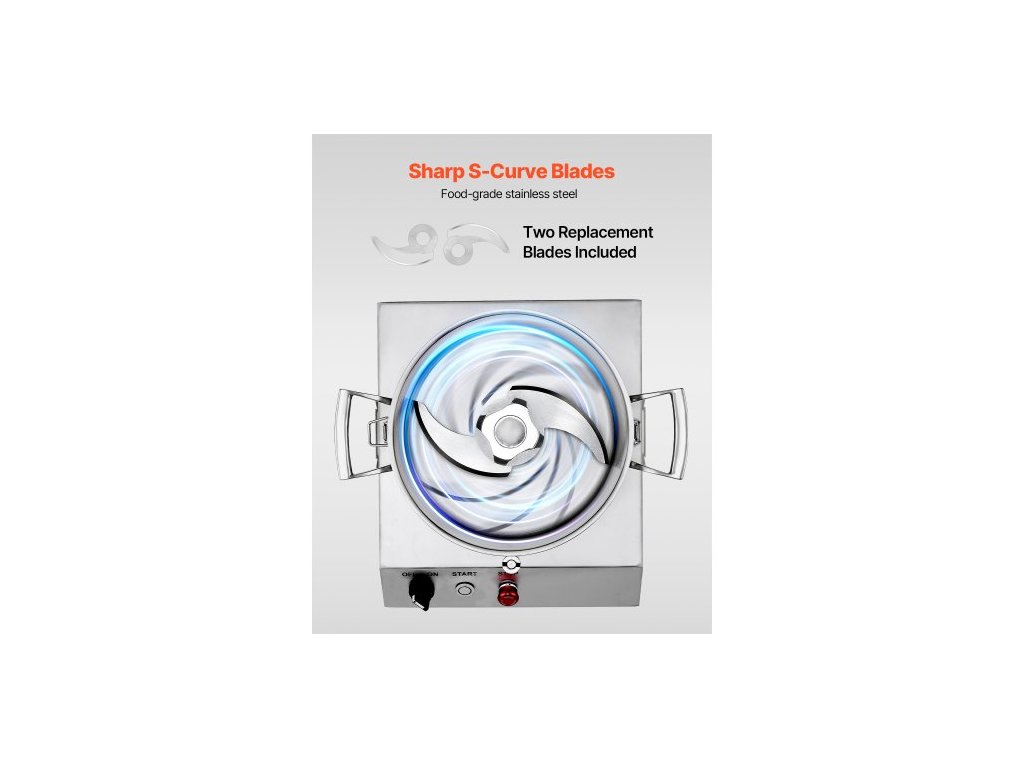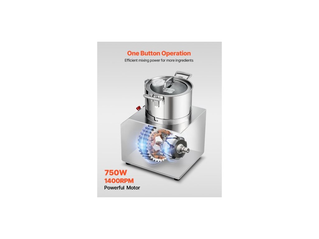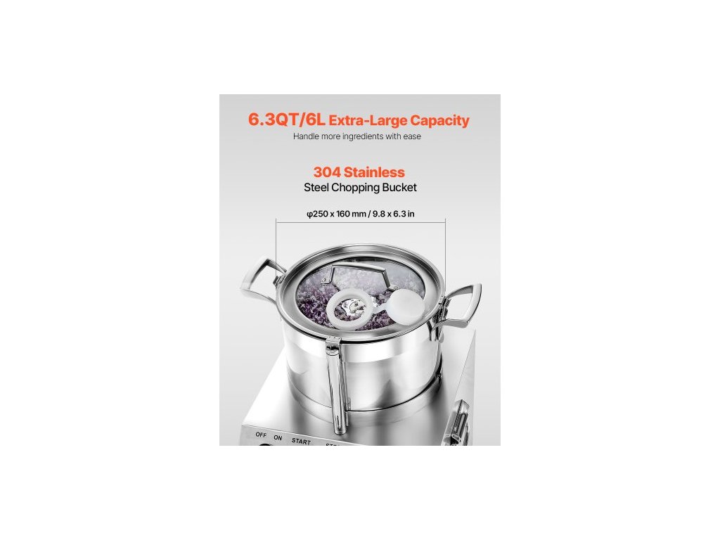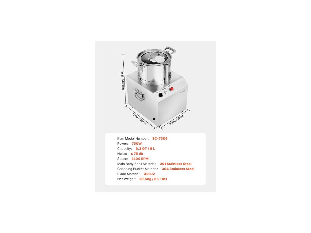 Materiál nožů: 420J2,Otáčky: 1400 ot./min,Objem: 6,3 QT / 6 l,Hlučnost: ≤ 75 db,Materiál sekací nádoby: nerezová ocel 304,Číslo modelu: SC-7306,Materiál hlavního tělesa: nerezová ocel 201,Čistá hmotnost: 65,1 lbs / 29,5 kg,Příkon: 750 W,Rozměry výrobku: 14,2 x 14 x 19,1 palců / 360 x 355 x 485 mm