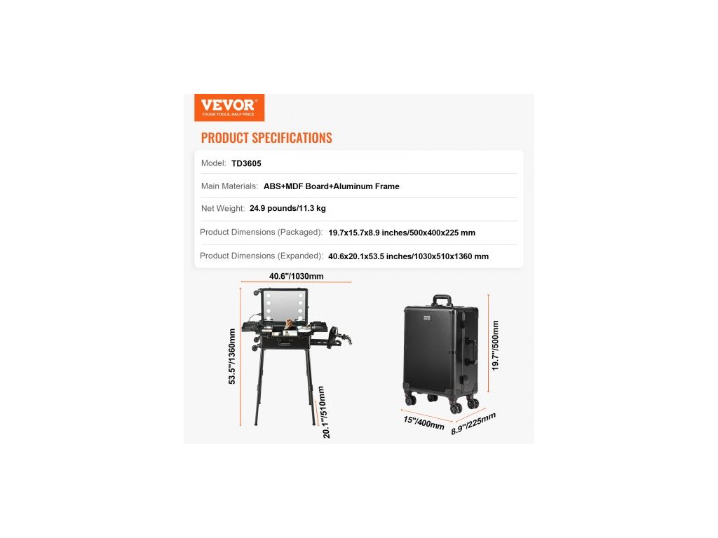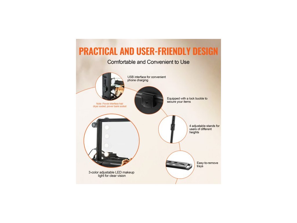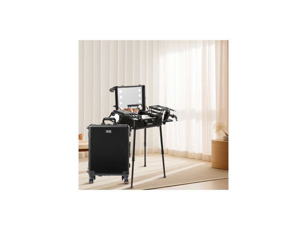 Kufřík na líčení se zámkem, osvětleným zrcadlem, 4 úložnými přihrádkami, držákem na štětce, cestovním organizérem na kosmetiku s otočnými kolečky, profesionálním kufříkem do ateliéru, volně stojící kufříkem