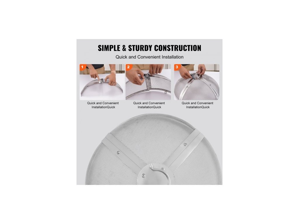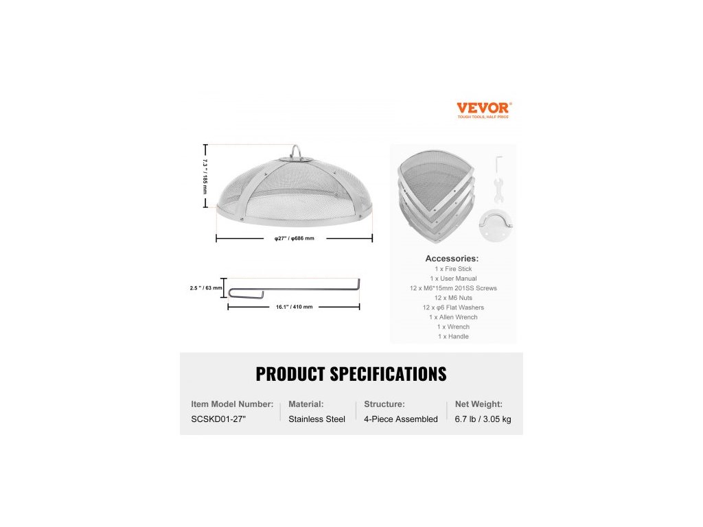 Vnitřní rozměry: φ26,1 x 6,7 palce / φ663 x 170 mm,Číslo modelu položky: SCSKD01-27",Materiál: nerezová ocel,Průměr pletiva: φ0,03 palce / φ0,8 mm,Průměr otvoru v pleti: φ0,08 palce / φ2 mm,Konstrukce: Sestavená ze 4 dílů,Rozměry výrobku: φ26,3 x 7,3 palce / φ670 x 185 mm,Průměry: 27 palců / 686 mm,Čistá hmotnost: 6,7 lb / 3,05 kg,Rozměry ohnivého pohrabáče: 16,1 x 2,5 x 0,2 palce / 410 x 63 x 6 mm