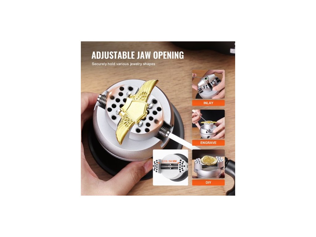 Kuličkový svěrák , nástroj pro usazení gravírování 7,6 cm, svěrák s rotací gravírovacího bloku o 360°, 70 ks nástavců, standardní blok pro intarzii drahokamů a maloobjemové gravírováníVýjimečné materiály a řemeslné zpracování