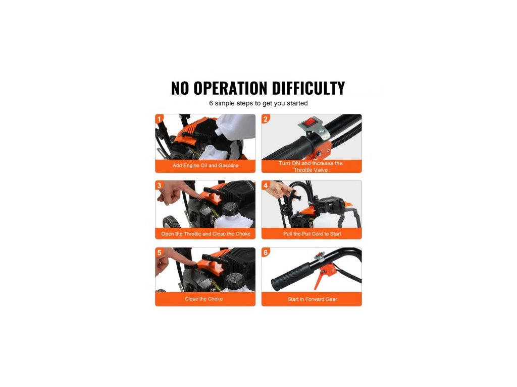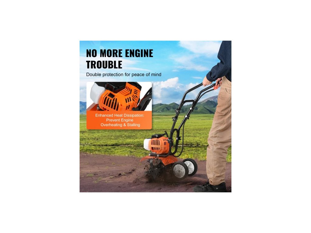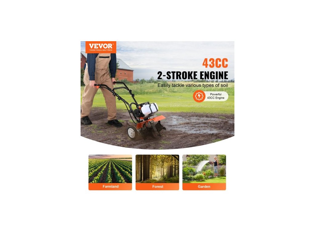 Kultivátor s benzínovým pohonem, 43cc dvoutaktní zahradní kultivátor, kultivátor se 4 ocelovými nastavitelnými předními hroty pro obdělávání trávníku, zahrady a poleDlouhotrvající používání