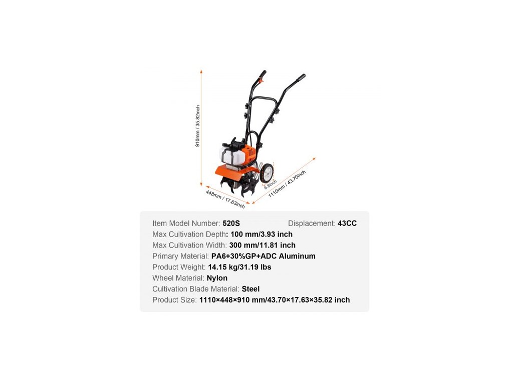 Hlavní materiál: PA6+30%GP, hliník ADC, Maximální hloubka kultivace: 100 mm/3,93 palce, Čísla certifikátů NRMM: 16/1628*2016/1628SHA1/P*1189*00, Číslo modelu položky: 520S, Hmotnost výrobku: 14,15 kg/31,19 liber, Maximální šířka kultivace: 300 mm/11,81 palce, Zdvihový objem: 43cc, Materiál kol: Nylon, Materiál kultivační čepele: Ocel, Rozměry produktu: 1110x448x910 mm / 43,70x17,63x35,82 palce