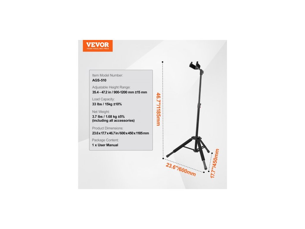 Kytarový stojan Tripod, skládací, 900–1200 mm (35,4–47,2 palce), nastavitelná výškaRobustní konstrukce