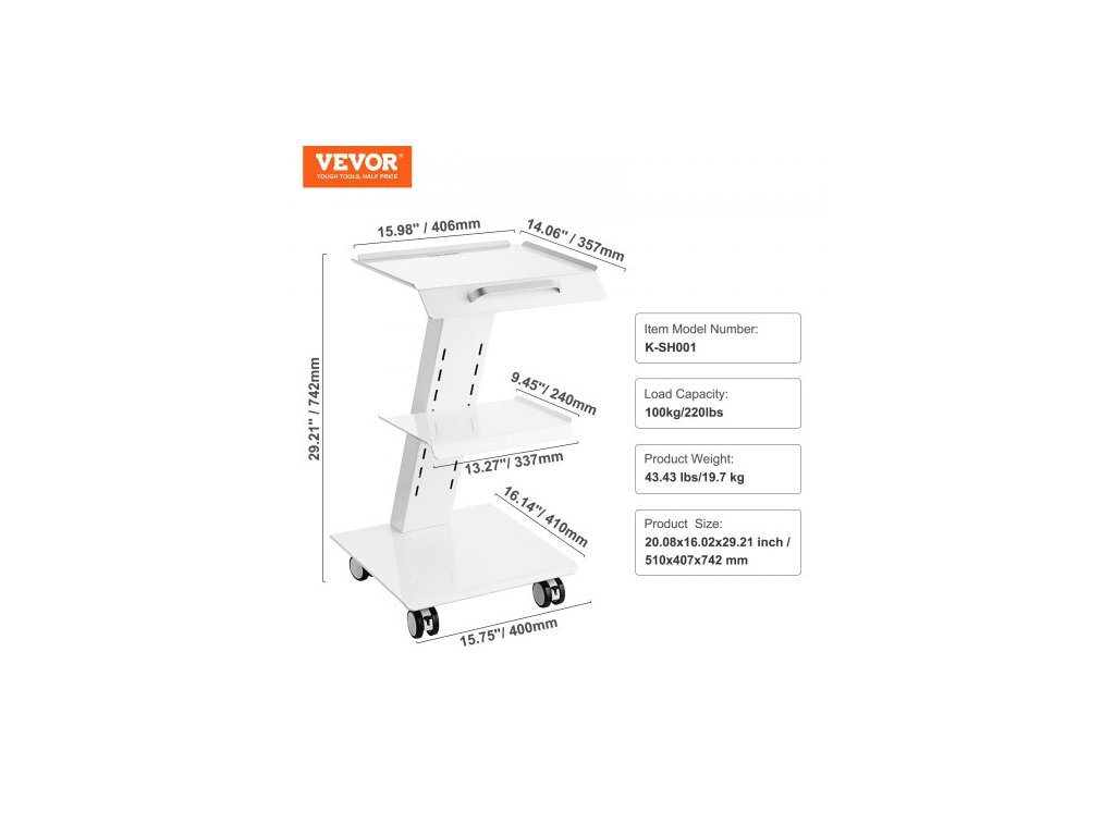 Nosnost: 100 kg/200 kg, Napětí: 110 V, Číslo modelu položky: K-SH001, Hmotnost výrobku: 19,7 kg, Materiál: Ocel, Železo, Vrstva: 3 vrstvy, Kolečka: Čtyři otočná kolečka (2 uzamykatelná), Rozměry výrobku: 510 x 407 x 742 mm