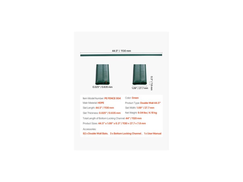 Tloušťka lamel: 0,025" / 0,635 mm,Rozměry produktu: 44,5" x 1,09" x 0,3" / 1130 x 27,7 x 7,8 mm,Typ produktu: Dvoustěnný 44,5",Barva: Zelená,Celková délka spodního uzamykacího kanálu: 44" / 1120 mm,Číslo modelu položky: PE FENCE 004,Délka lamel: 44,5" / 1130 mm, šířka lamely: 1,09" / 27,7 mm, hmotnost netto: 9,04 lbs / 4,10 kg, hlavní materiál: HDPE