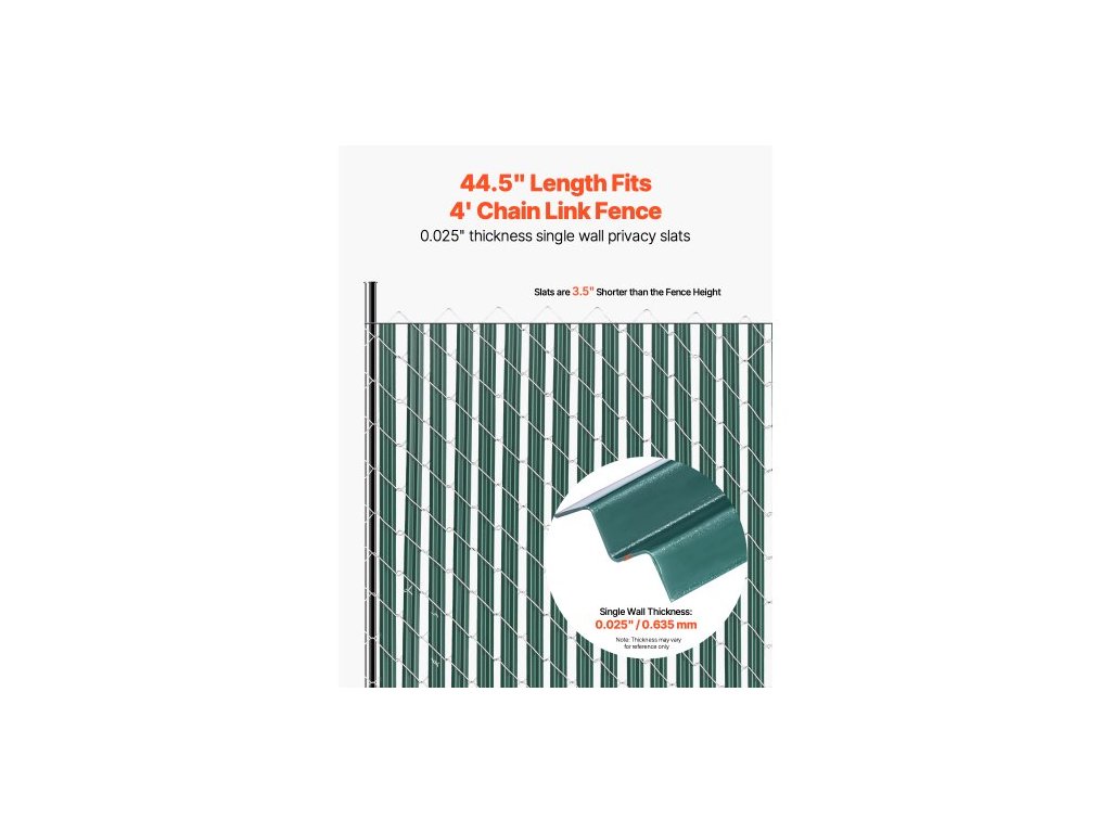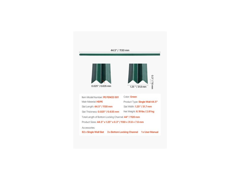 Tloušťka lamely: 0,025" / 0,635 mm,Rozměry produktu: 44,5" x 1,25" x 0,3" / 1130 x 31,8 x 7,6 mm,Typ produktu: Jednostěnný 44,5",Barva: Zelená,Celková délka spodního uzamykacího kanálu: 44" / 1120 mm,Číslo modelu položky: PE FENCE 001,Délka lamely: 44,5" / 1130 mm, šířka lamely: 1,25" / 31,7 mm, hmotnost netto: 6,19 lbs / 2,81 kg, hlavní materiál: HDPE