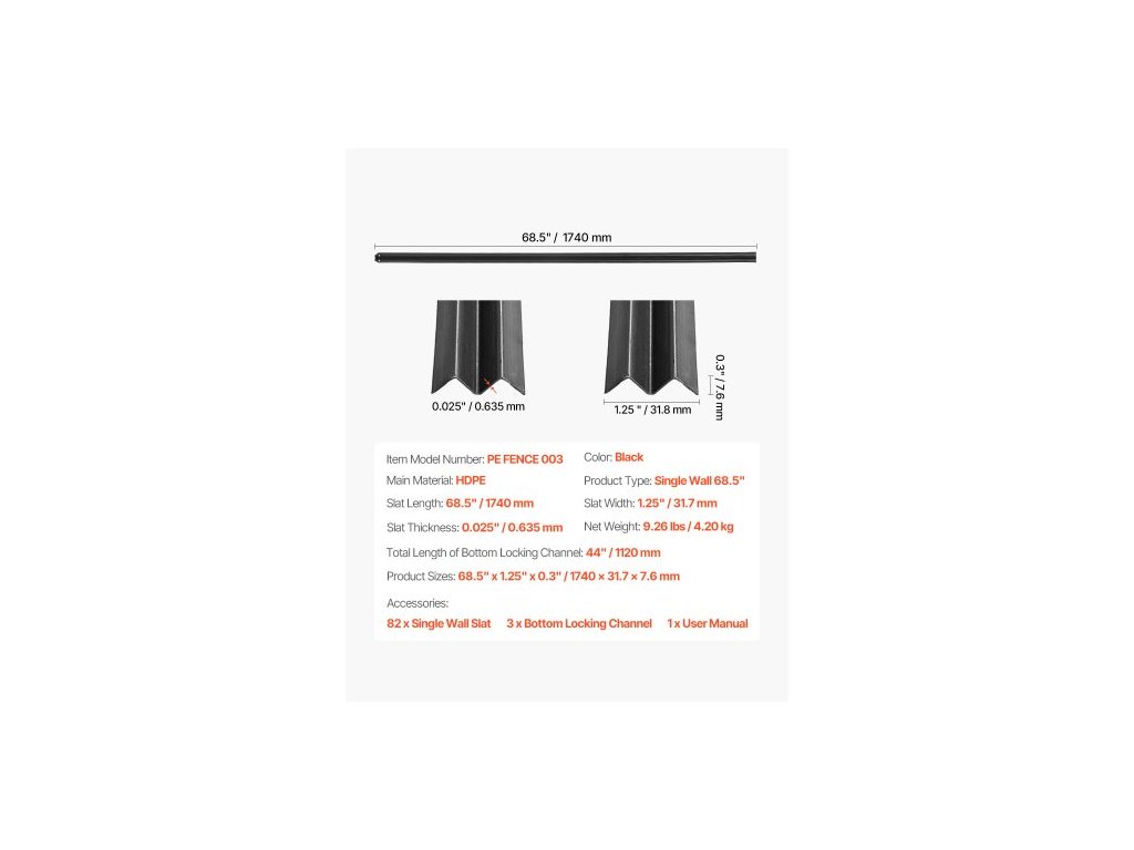 Tloušťka lamely: 0,025" / 0,635 mm,Rozměry produktu: 68,5" x 1,25" x 0,3" / 1740 x 31,7 x 7,6 mm,Typ produktu: Jednostěnný 68,5",Barva: Černá,Celková délka spodního uzamykacího kanálu: 44" / 1120 mm,Číslo modelu položky: PE FENCE 003,Délka lamely: 68,5" / 1740 mm, šířka lamel: 1,25" / 31,7 mm, hmotnost netto: 9,26 lbs / 4,20 kg, hlavní materiál: HDPE