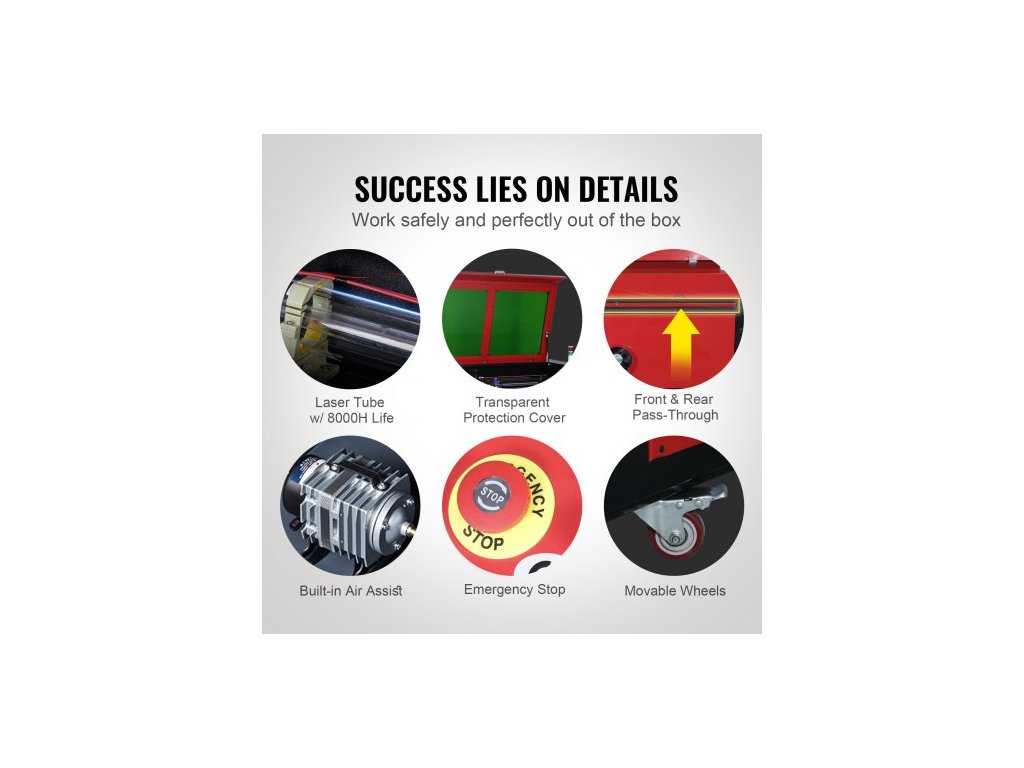 Hladina hluku: ≤70 dB,Kompatibilní systémy: Windows, Linux, MacOS,Provozní rychlost: 19,7 IPS/0–500 mm/s,Životnost laserové trubice: ≥8000H,Podporný software: LightBurn, CoreIDRAW, AutoCAD,Napětí: AC 220 V, 50 Hz,Efektivní práce Plocha: 600 x 900 mm, Číslo modelu položky: KH9060, Maximální tloušťka řezu: ≤ 15 mm (akryl)