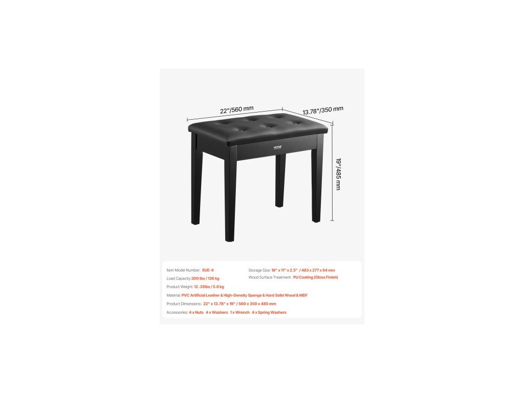 Rozměry úložného prostoru: 483 x 277 x 64 mm,Nosnost: 136 kg,Číslo modelu položky: SUE-4,Hmotnost výrobku: 5,55 kg,Materiál: Umělá PVC kůže a houba s vysokou hustotou a tvrdé masivní dřevo a MDF,Povrchová úprava dřeva: PU lak (lesklý povrch),Rozměry výrobku: 560 x 350 x 485 mm