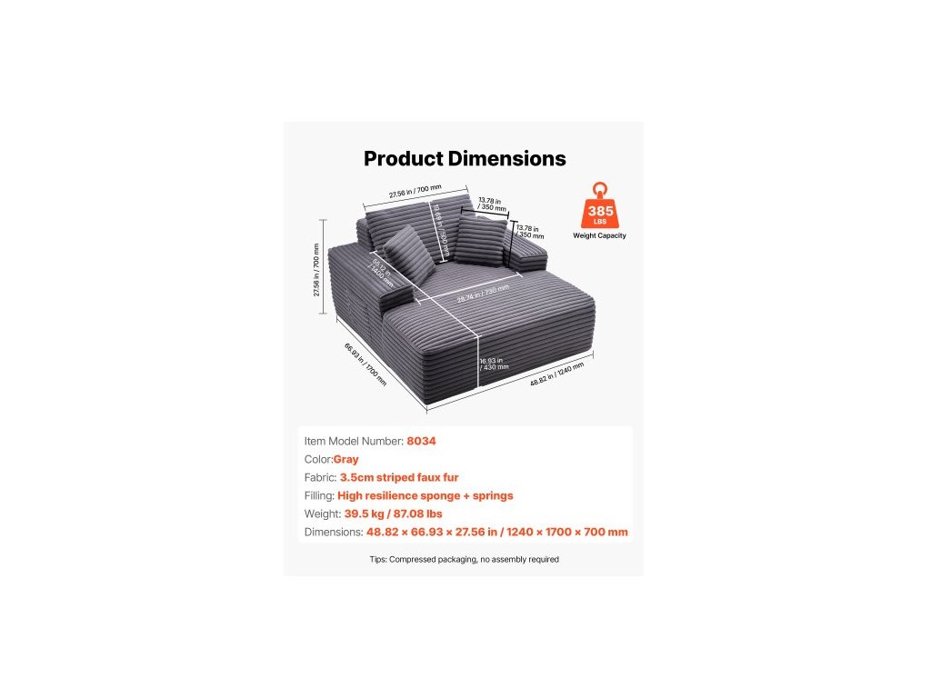 Barva: Šedá,Model: 8034,Rozměry: 48,82×66,93×27,56 palce / 1240×1700×700 mm,Výplň: Vysoce pružná houba + pružiny,Látka: 3,5cm pruhovaná umělá kožešina,Hmotnost: 39,5 kg / 87,08 lbs