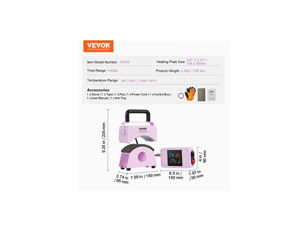 Rozměry topné desky: 5,9" x 3,15" / 150 x 80 mm,Časový rozsah: 1-999 s,Barva: fialová,Číslo modelu položky: DF55A,Hmotnost výrobku: 3,2 kg / 7,05 lbs,Teplotní rozsah: 40℃-205℃ / 104°F-401°F,Rozměry výrobku: 180 x 95 x 235 mm / 7,09 x 3,74 x 9,25 palce