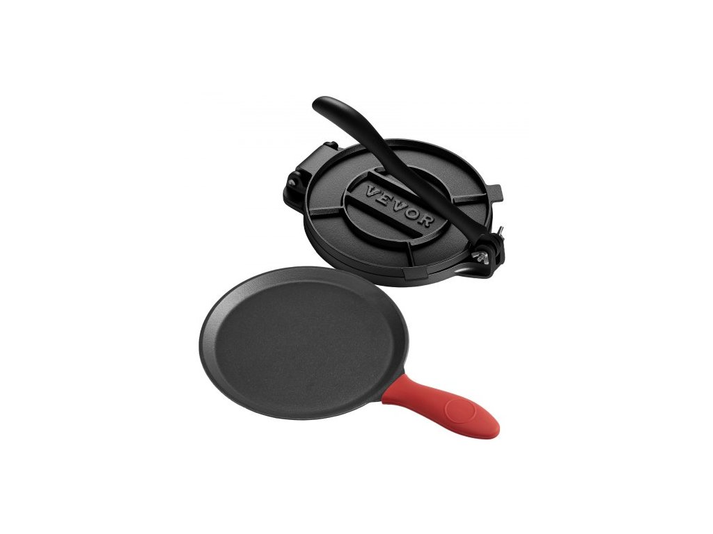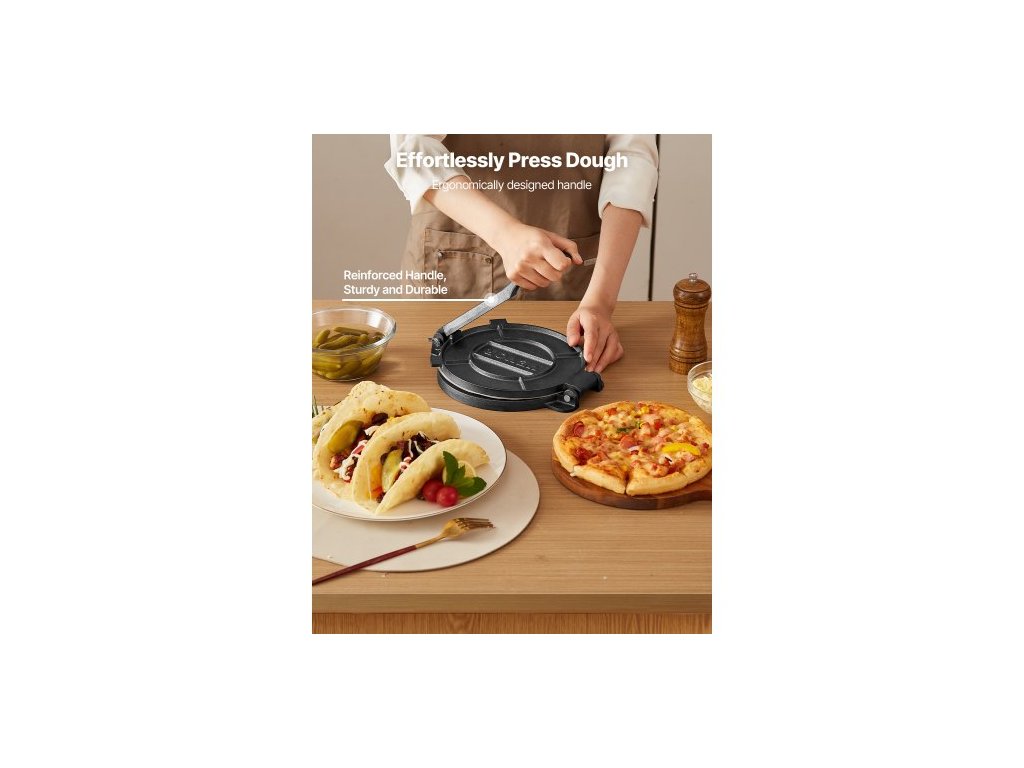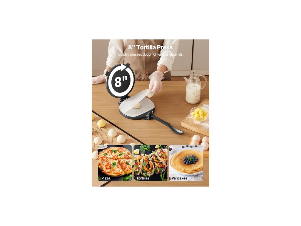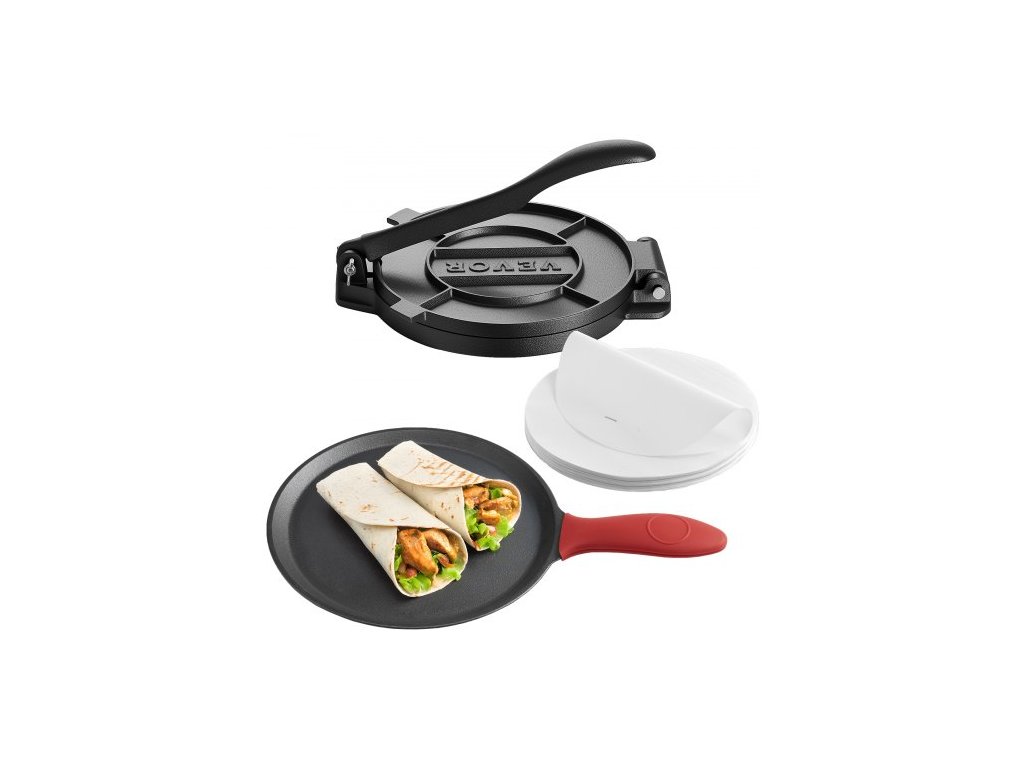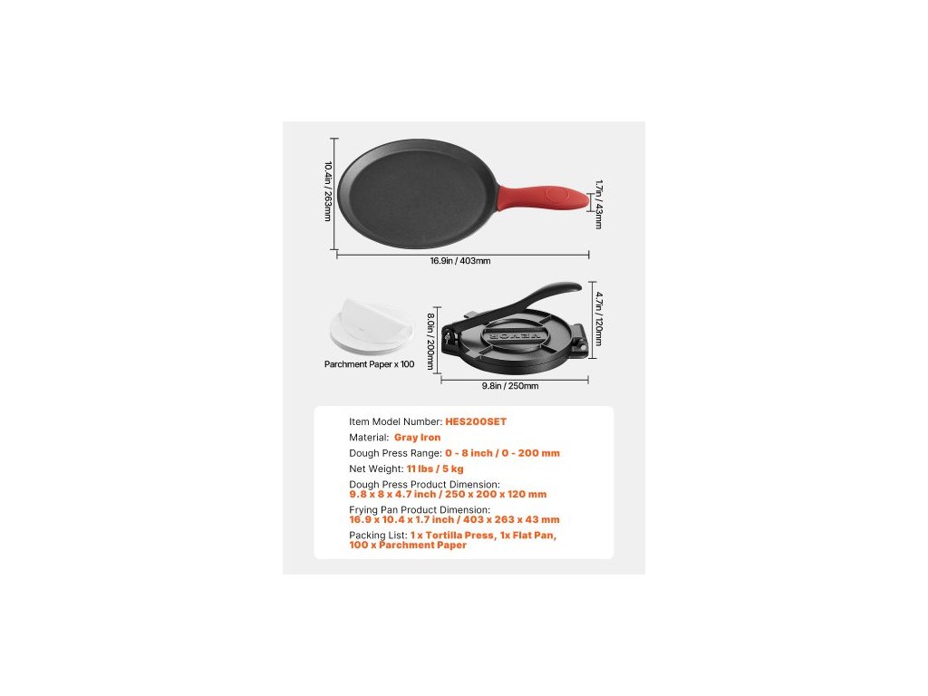 Lis na tortilly , litinový lis na tortilly a roti 8 palců, vysoce odolný lis na tortilly, lis na pataconery s rukojetí a 100 kusy pergamenového papíru, lis na taco těsta pro moučné tortilly, ruční lis na tortilly, různé druhy těsta, ergonomický design, jednoduché ovládání ve 4 krocích, všestranné použití, unikátní povrchová úprava, rozměry pánve: 16,9 x 10,4 x 1,7 palce / 403 x 263 x 43 mm, rozsah lisu na těsto: 0 - 8 palců / 0 - 200 mm, číslo modelu: HES200SET, rozměry lisu na těsto: 9,8 x 8 x 4,7 palce / 250 x 200 x 120 mm, materiál: šedá litina, hmotnost bez vlákna: 11 5 kgDoplňkové parametry