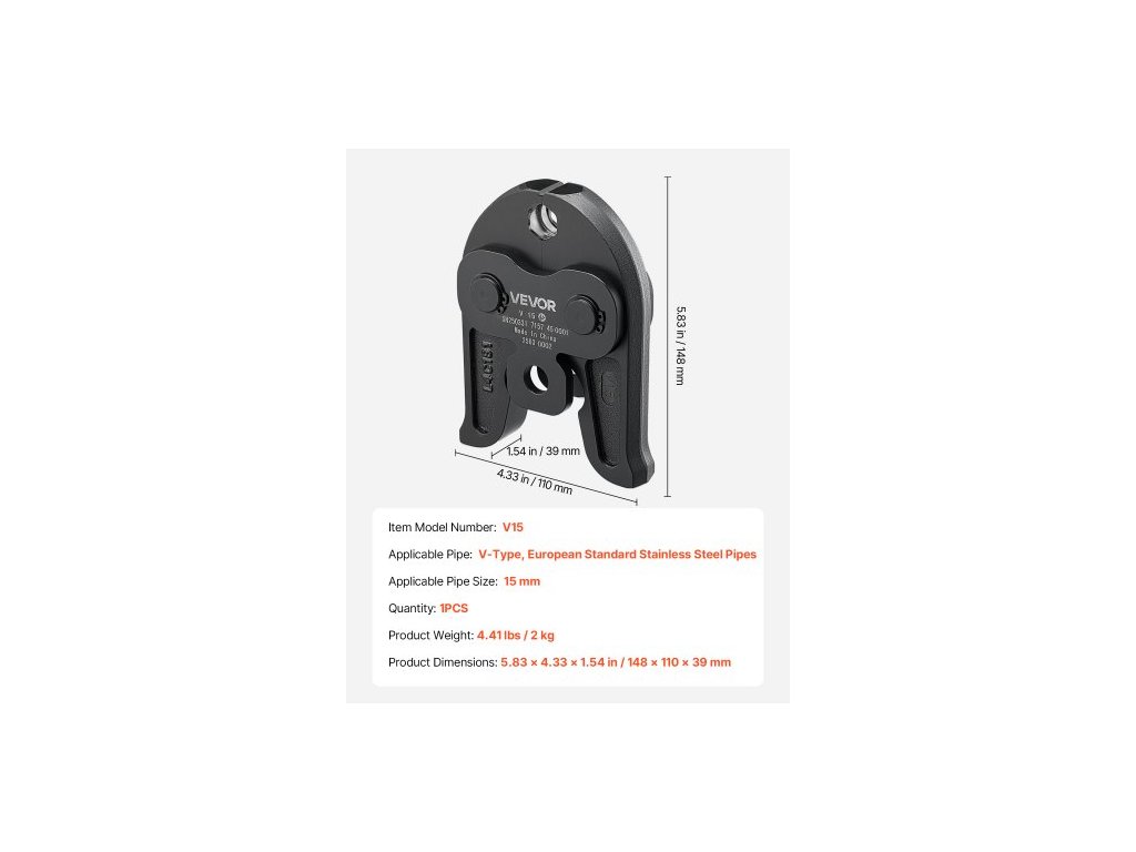 Použitelné trubky: Typ V, trubky z nerezové oceli evropského standardu,Použitelná velikost trubky: 15 mm,Číslo modelu položky: V15,Hmotnost výrobku: 4,41 lbs / 2 kg,Množství: 1 ks,Rozměry výrobku: 5,83 x 4,33 x 1,54 palce / 148 x 110 x 39 mm