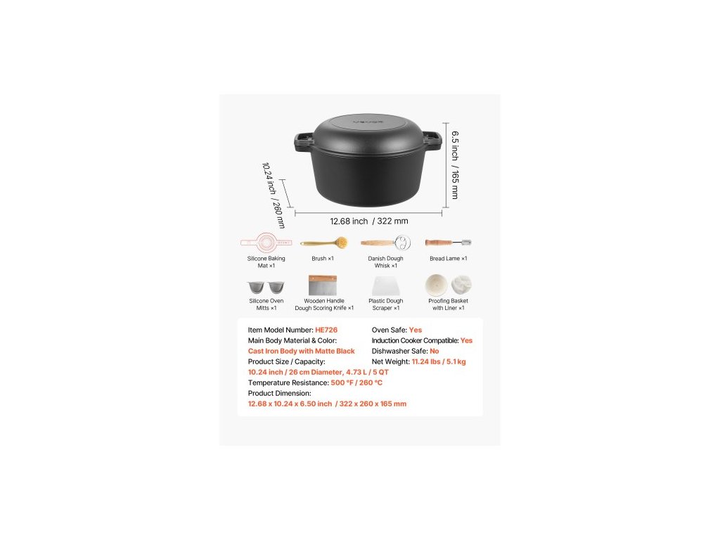 Rozměry výrobku: 12,68 x 10,24 x 6,50 palce / 322 x 260 x 165 mm,Objem: 4,73 l / 5QT,Číslo modelu položky: HE726,Teplotní odolnost: 500 ℉ / 260 ℃,Vnitřní a vnější nátěr: Předem ochucený rostlinný olej,Čistá hmotnost: 11,24 lbs / 5,1 kg,Hlavní materiál: Litina