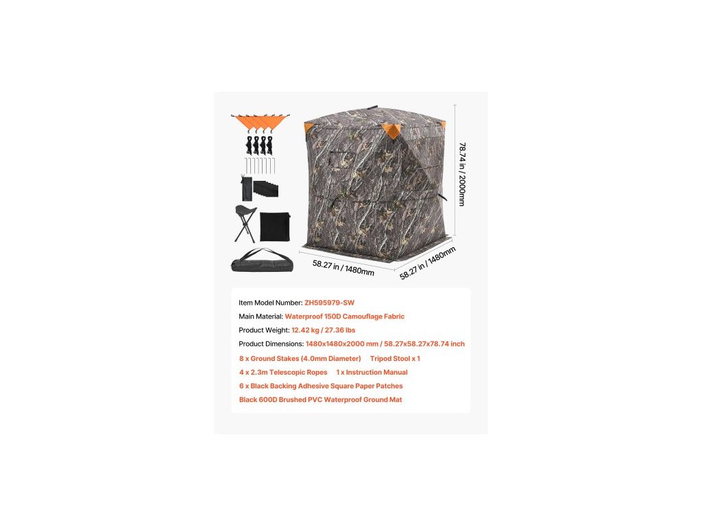 Číslo modelu položky: ZH595979-SW,Hmotnost výrobku: 12,42 kg / 27,36 lbs,Rozměry výrobku: 1480x1480x2000 mm / 58,27x58,27x78,74 palce,Hlavní materiál: Voděodolná maskovací tkanina 150D