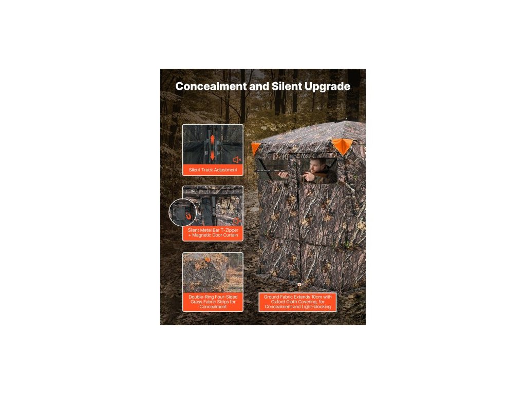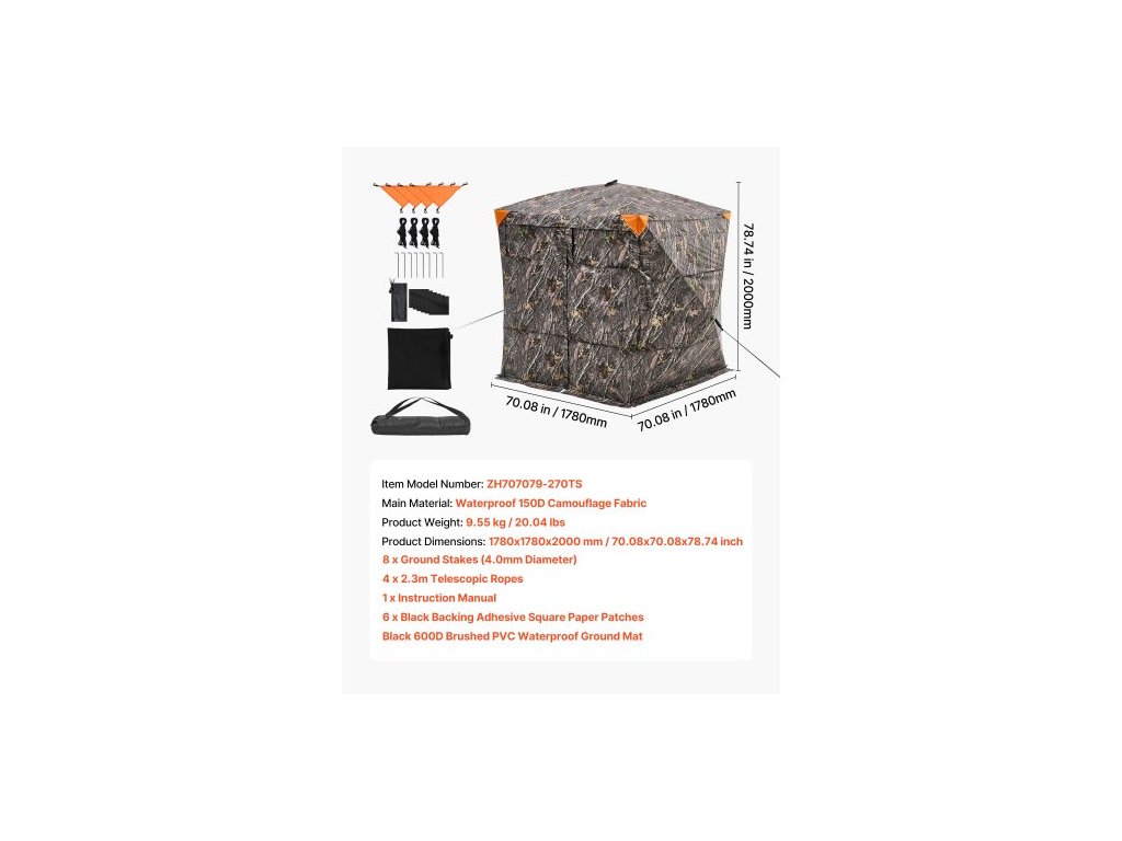 Číslo modelu položky: ZH707079-270TS,Hmotnost výrobku: 9,55 kg / 20,04 lbs,Rozměry výrobku: 1780x1780x2000 mm / 70,08x70,08x78,74 palce,Hlavní materiál: Voděodolná maskovací tkanina 150D