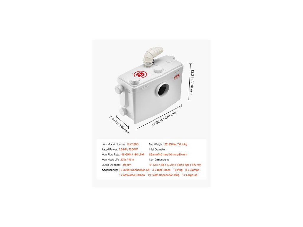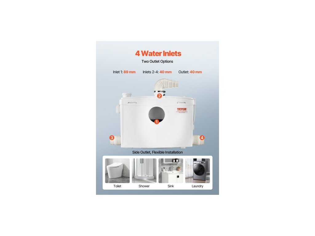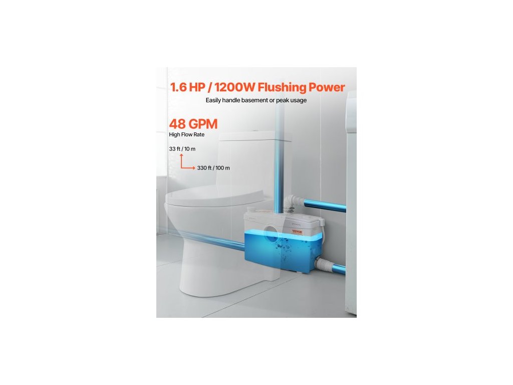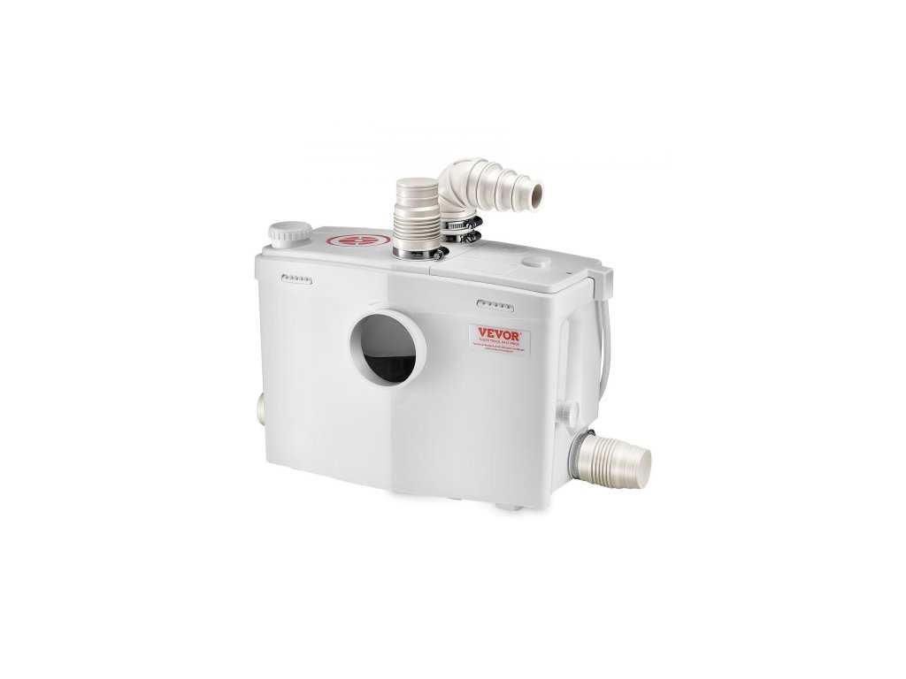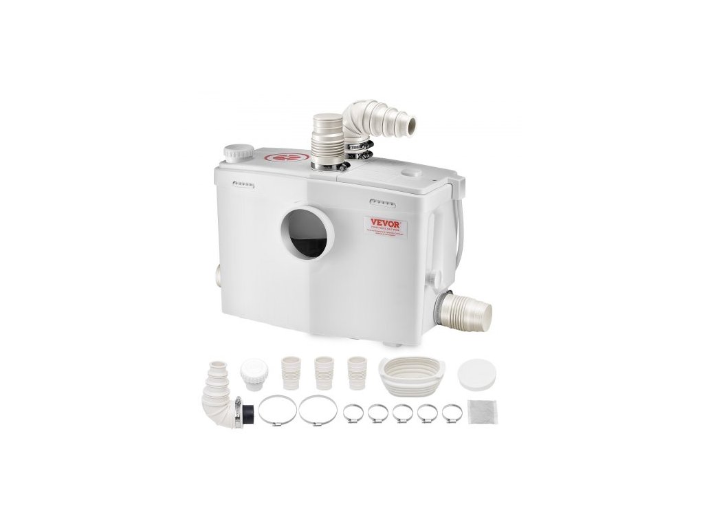 Macerátorové čerpadlo , 1200 W, průtok 180 l/min (48 GPM), dopravní výška 33 ft/10 m, macerátorové čerpadlo na kanalizační toalety se 4 přívody vody, splachovací zařízení pro likvidaci odpadní vody, toaletu, sklep, sprchu, umyvadlo, prádelnu a vanuVýkonný výkon