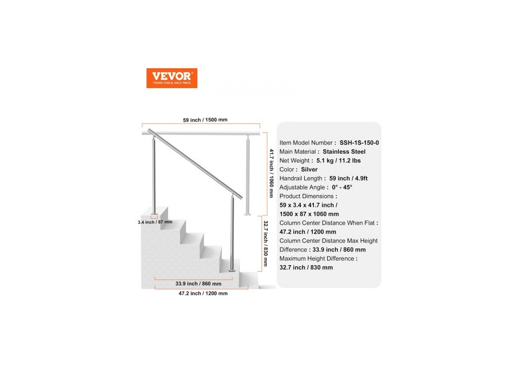 Nastavitelný rozsah úhlu: 0° - 45°,Boční tlaková síla: 60 kg,Barva: Stříbrná,Svislá nosnost: 100 kg,Vzdálenost středu sloupů (v rovině): 1200 mm,Rozměry výrobku: D x Š x V: 1500 x 87 x 1060 mm,Délka madla: 1500 x 1500 mm, Tažná síla: 90 kg, Číslo modelu položky: SSH-1S-150-0, Maximální výškový rozdíl: 830 ± 5 mm, Čistá hmotnost: 5,1 kg ± 3 % (včetně veškerého příslušenství), Hlavní materiál: Nerezová ocel 201, Vzdálenost středu sloupu (max. výškový rozdíl): 860 ± 5 mm