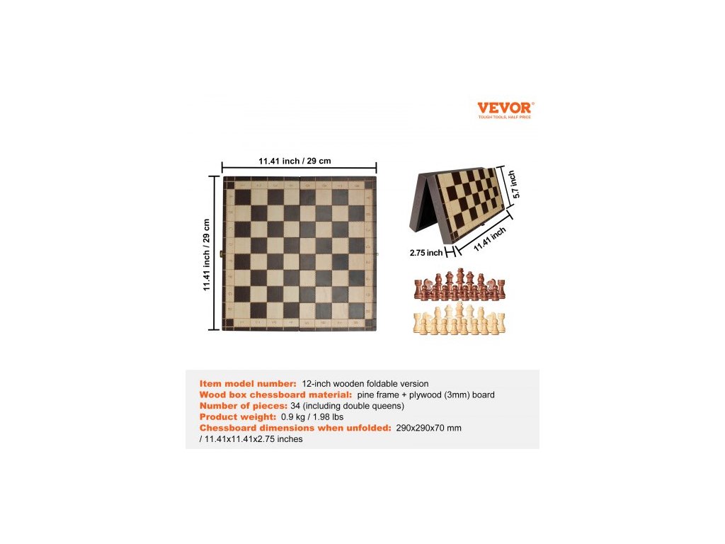 Rozměry šachovnice: 290x290x70 mm / 11,41x11,41x2,75 palce, Materiál šachovnice v dřevěné krabici: Borovicový rám + překližková deska, Číslo modelu: 12palcová dřevěná skládací verze, Hmotnost výrobku: 0,9 kg / 1,98 lbs