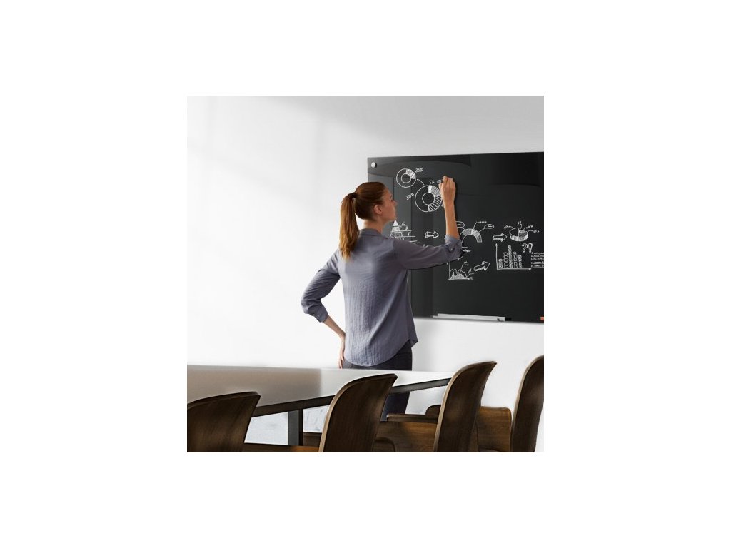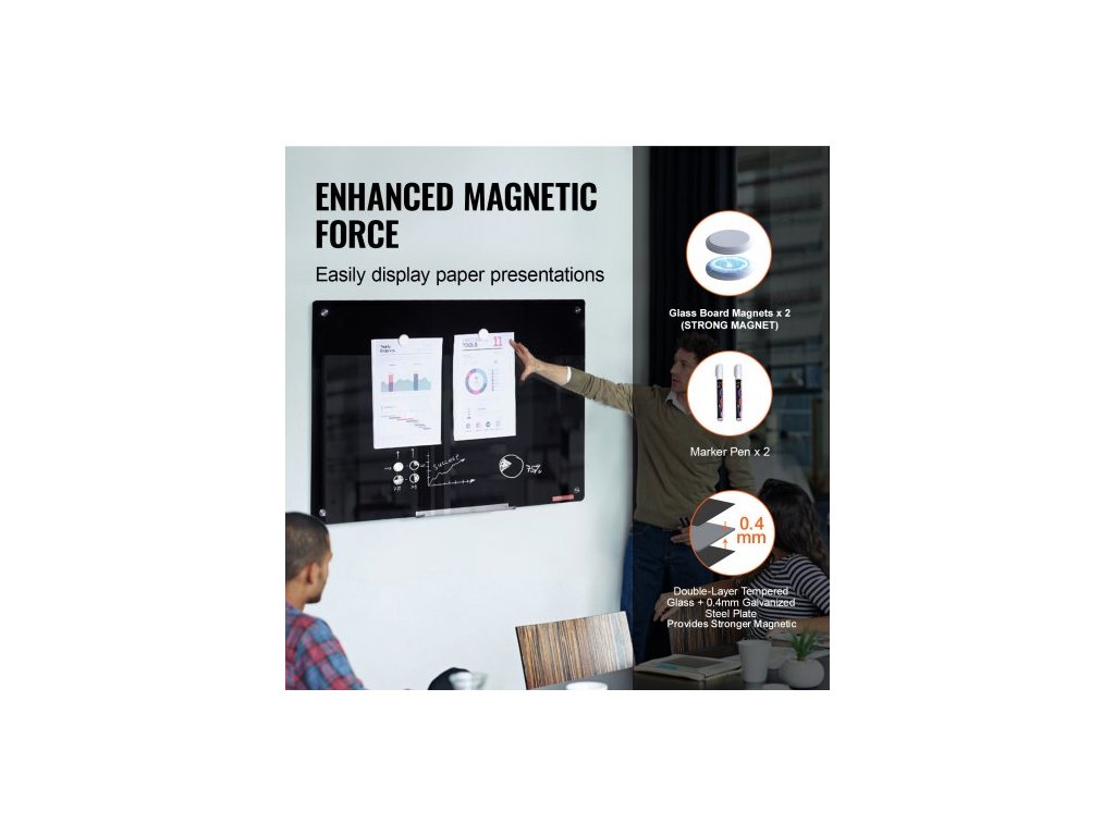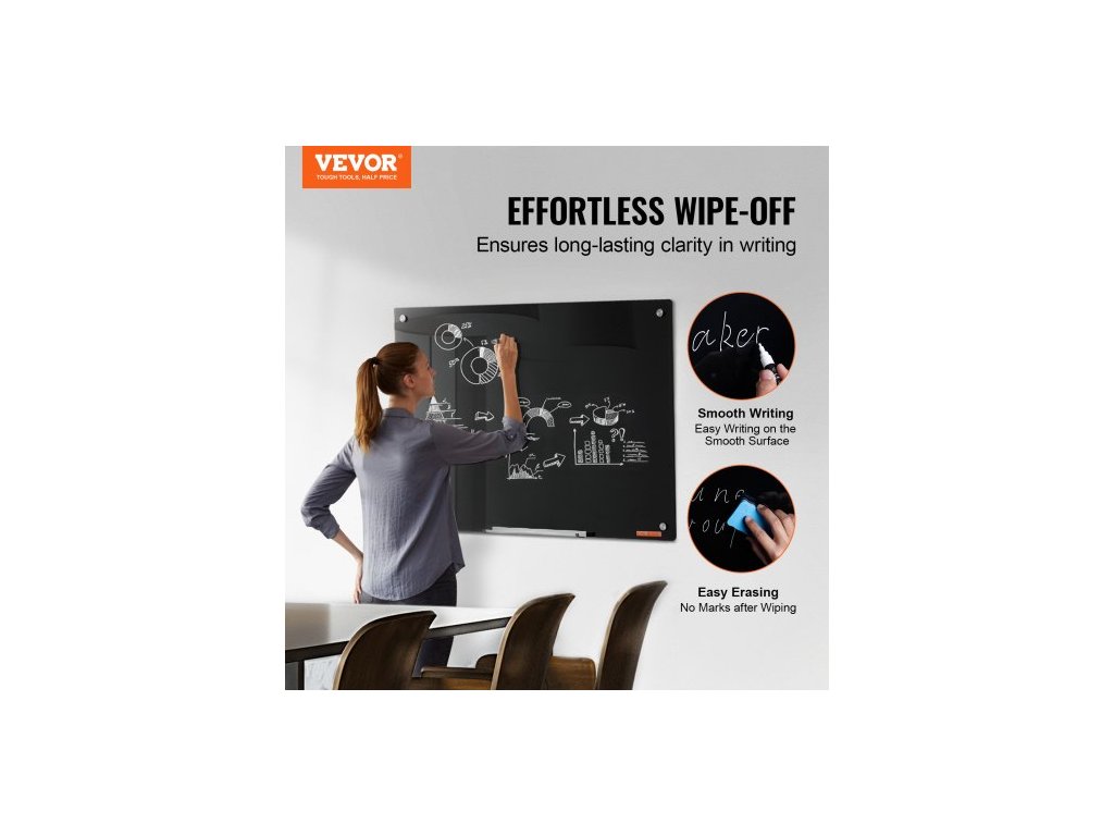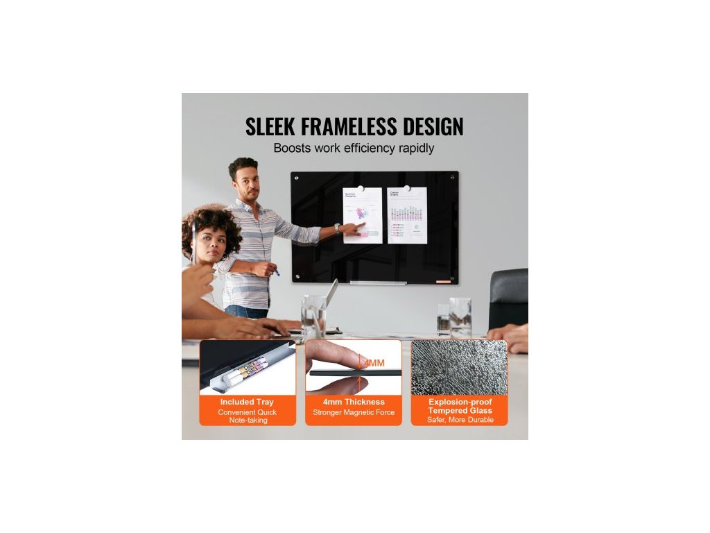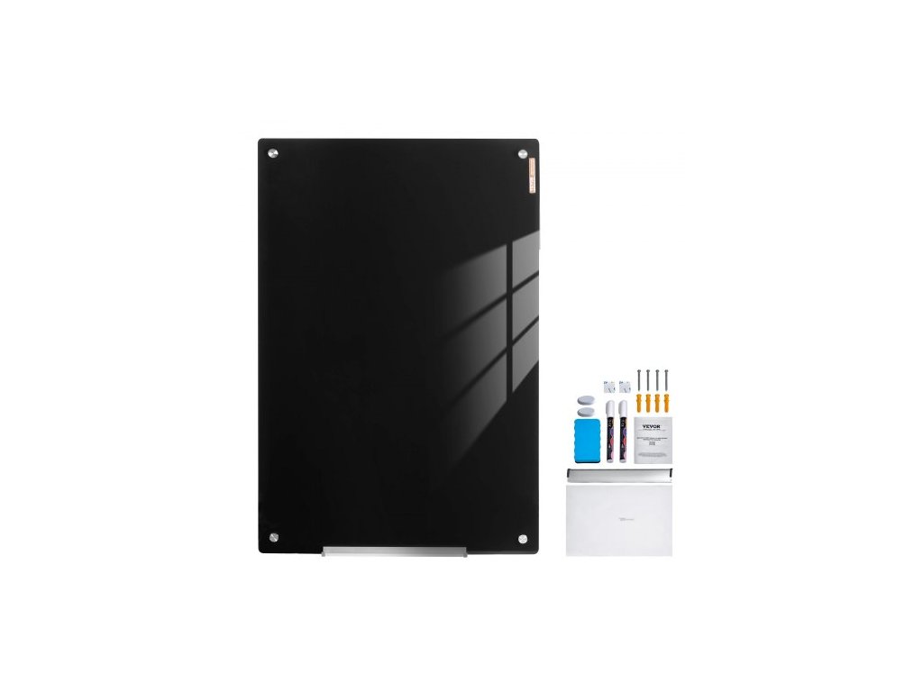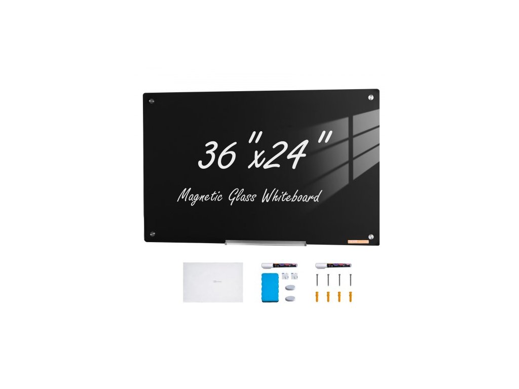Magnetická skleněná bílá tabule , tabule s mazáním za sucha 36"x24", velká bílá skleněná tabule k montáži na zeď, bezrámová, s odkládacím stolkem na fixy, gumou a 2 fixy, černáVýkonný magnetický úchyt