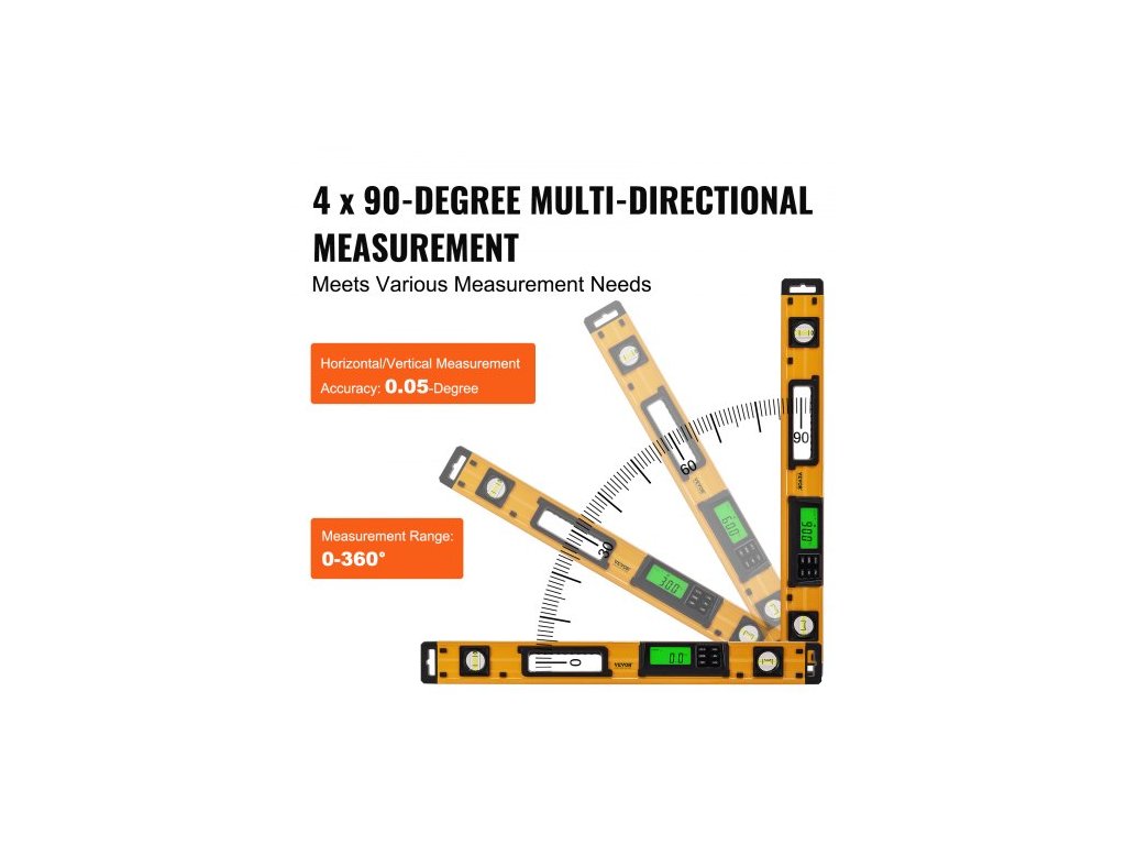 Magnetická torpédová vodováha , 600 mm, LED podsvícená obrazovka, mechanické pravítko s libelami pro 0-360 stupňů, gravitační senzor, hliníková slitinová nivelační libela s průzorem, odolná proti nárazům pro instalatérské práce a dřevo24palcová vysoce přesná digitální vodováha