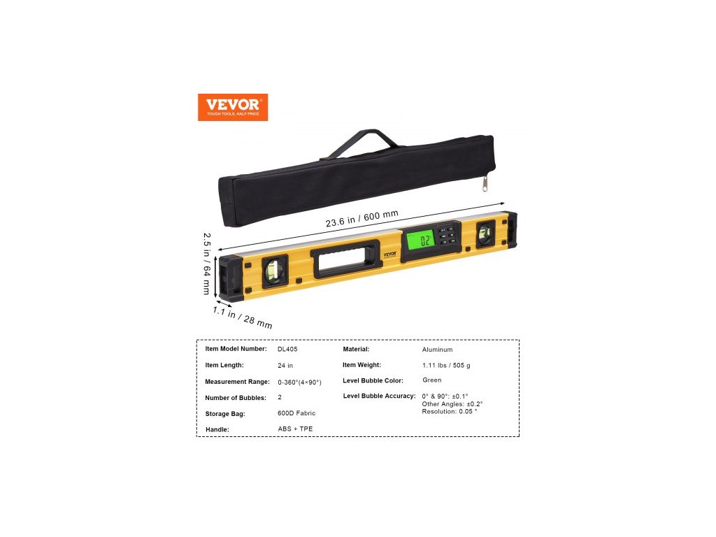 Barva libely vodováhy: zelená,Rozměry položky (D x Š x V): 23,62 x 1,1 x 2,52 palce / 600 x 28 x 64 mm,Přesnost libely vodováhy: 0,5 mm/m, 0,0005 palce/ft,Číslo modelu položky: DL405,Materiál: hliníková slitina,Délka položky: 24 palců,Materiál rukojeti: ABS + TPE, Hmotnost položky: 0,5 kg, Rozsah měření: 0–360 stupňů (4 x 90 stupňů), Počet bublin: 3