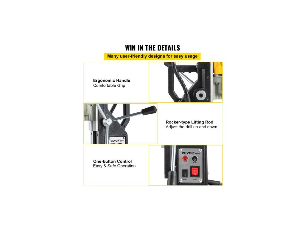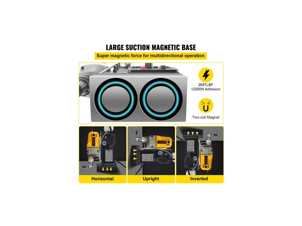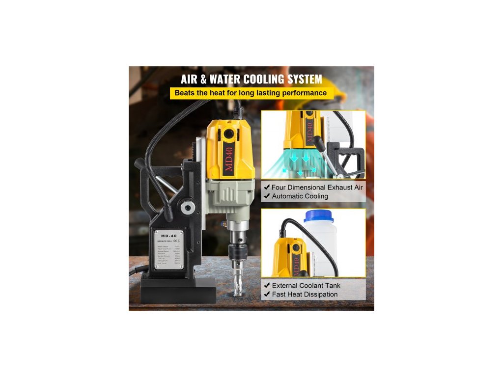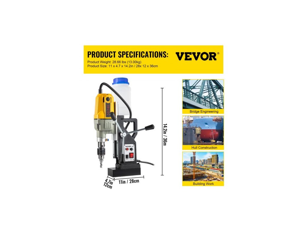 Max. Průměr vrtání (spirálový vrták): 16 mm, Max. průměr vrtání (jádrový vrták): 40 mm, Model: VV-MD-UK12, Hmotnost výrobku: 11 kg, Magnetická síla: 12000 N, Rozměry magnetické základny: 166 x 80 x 50 mm, Výkon: 1100 W, 50/60 Hz, 220 V, 5 A, Max. otáčky: 580 ot/min, Max. dráha vrtání: 150 mm, Max. hloubka vrtání: 55 mm, Rozměry výrobku: 36 x 28 x 12 cm