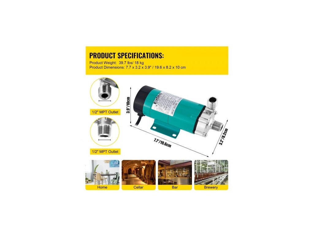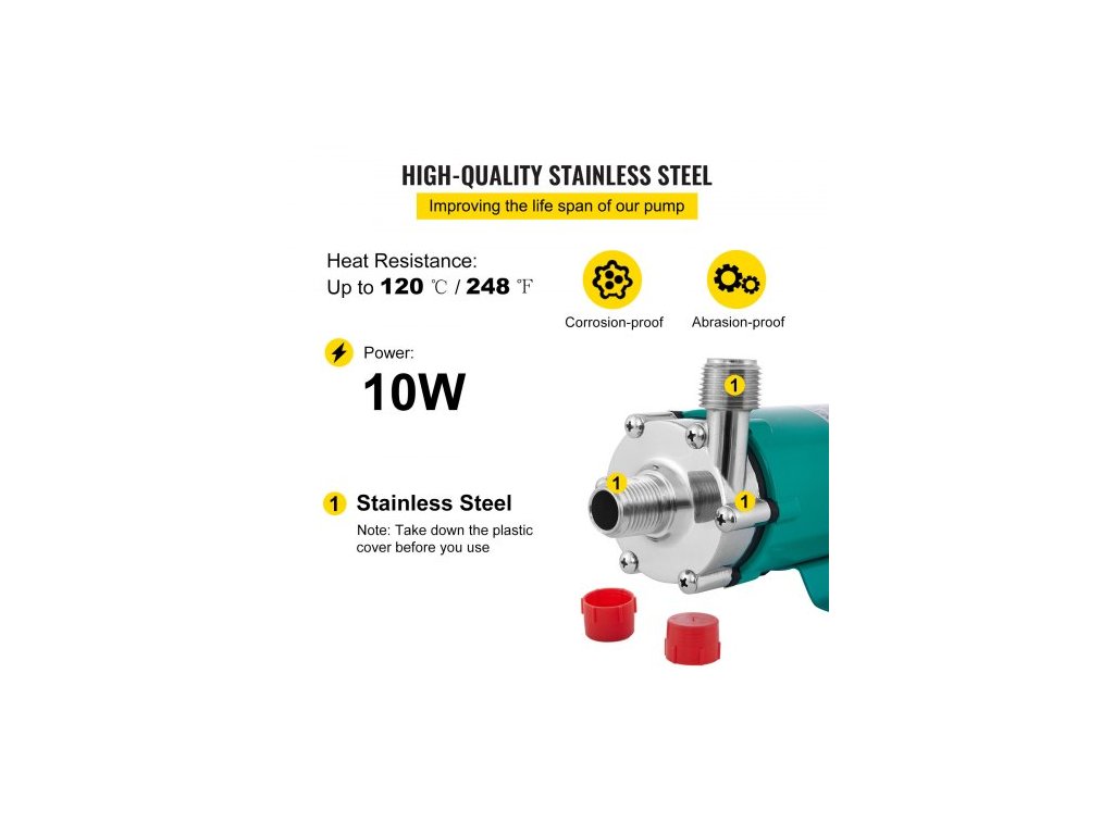 Otáčky: 2800 ot./min,Kombinace: 12,7 mm (1/2 palce),Max. průtok: 19 l/min (5 gpm),Hrubá hmotnost: 2,21 kg (4,87 lbs),Napětí: 220V / 50Hz,Model: VV-BBP-10,Materiál: Nerezová ocel,Max. dopravní výška: 3,4 m (10 stop),Max. teplota: 120 ℃ (248 ℉),Proud: 240 mA,Příkon: 10 W