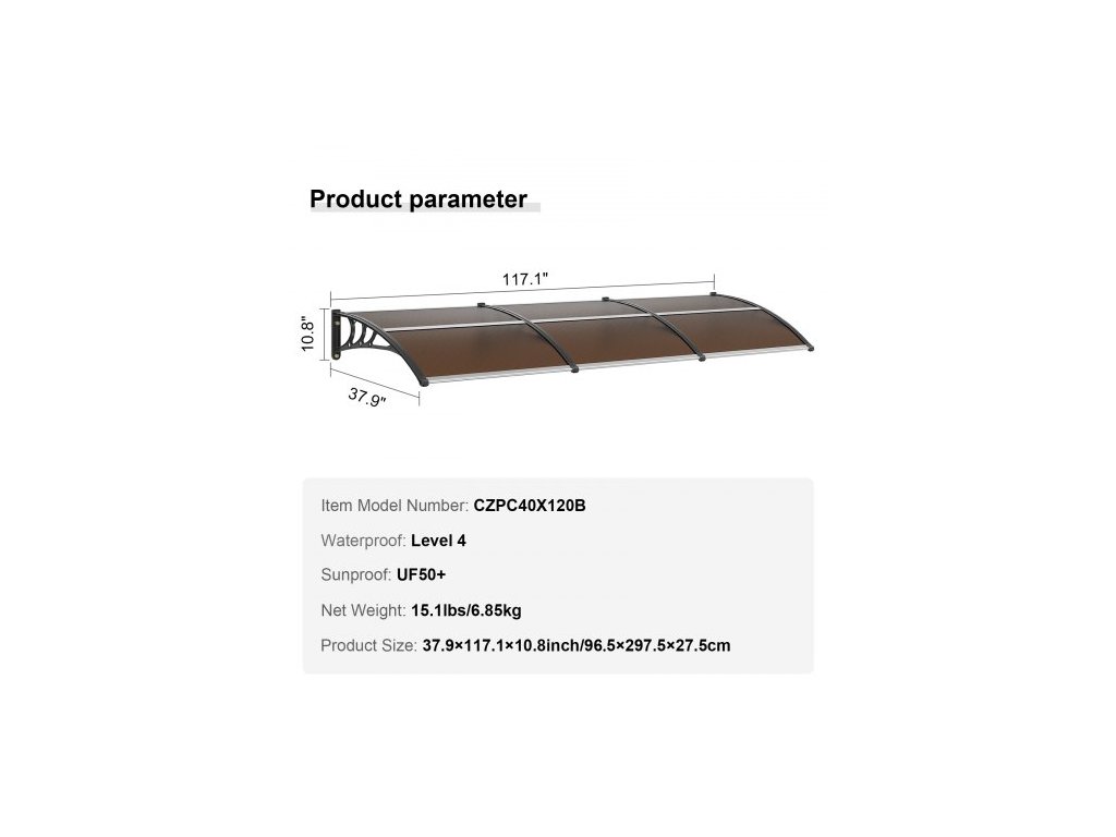 Voděodolnost: Úroveň 4, Barva: Hnědý plech/Černý držák/Stříbrný konektor, Ochrana proti slunci: UF50+, Číslo modelu položky: CZPC40X120B, Materiál: PC plech + ABS držák + hliníkový konektor, Čistá hmotnost: 15 lbs / 6,85 kg, Rozměry výrobku: 38" x 117" / 965 x 2975 mm
