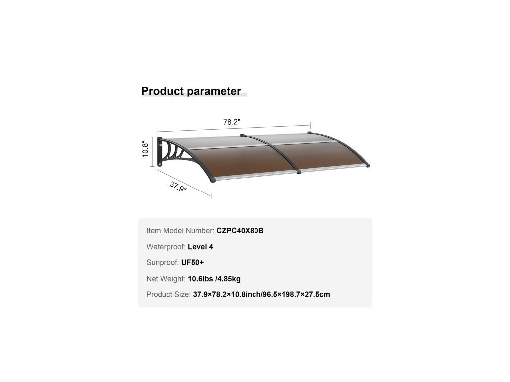 Voděodolnost: úroveň 4, barva: hnědý plech/černý držák/stříbrný konektor, ochrana proti slunci: UF50+, číslo modelu: CZPC40X80B, materiál: PC plech + ABS držák + hliníkový konektor, čistá hmotnost: 10,7 lbs / 4,85 kg, rozměry výrobku: 38" x 78" / 965 x 1987 mm