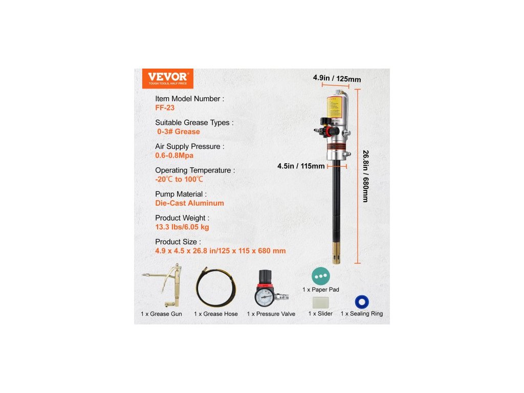 Materiál čerpadla: Tlakově litý hliník,Provozní teplota: -4℉ až 212℉/-20℃ až 100℃,Číslo modelu položky: FF-23,Hmotnost výrobku: 13,3 lbs/6,05 kg,Tlak přívodu vzduchu: 0,6-0,8 MPa,Vhodné typy maziva: Mazivo 0-3#,Rozměry výrobku: 4,9 x 4,5 x 26,8 palce/125 x 115 × 680 mm