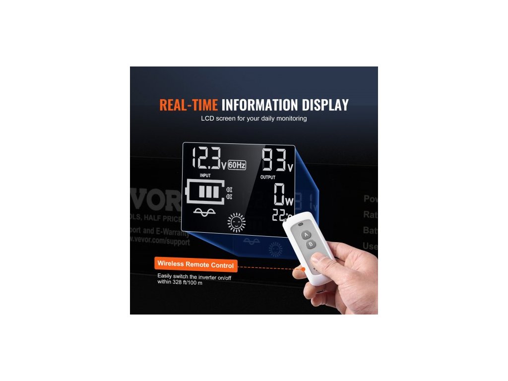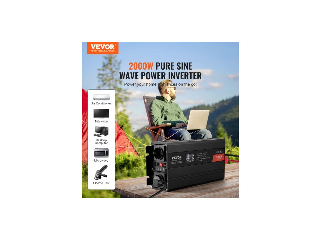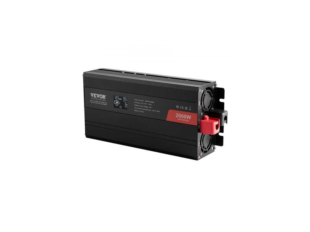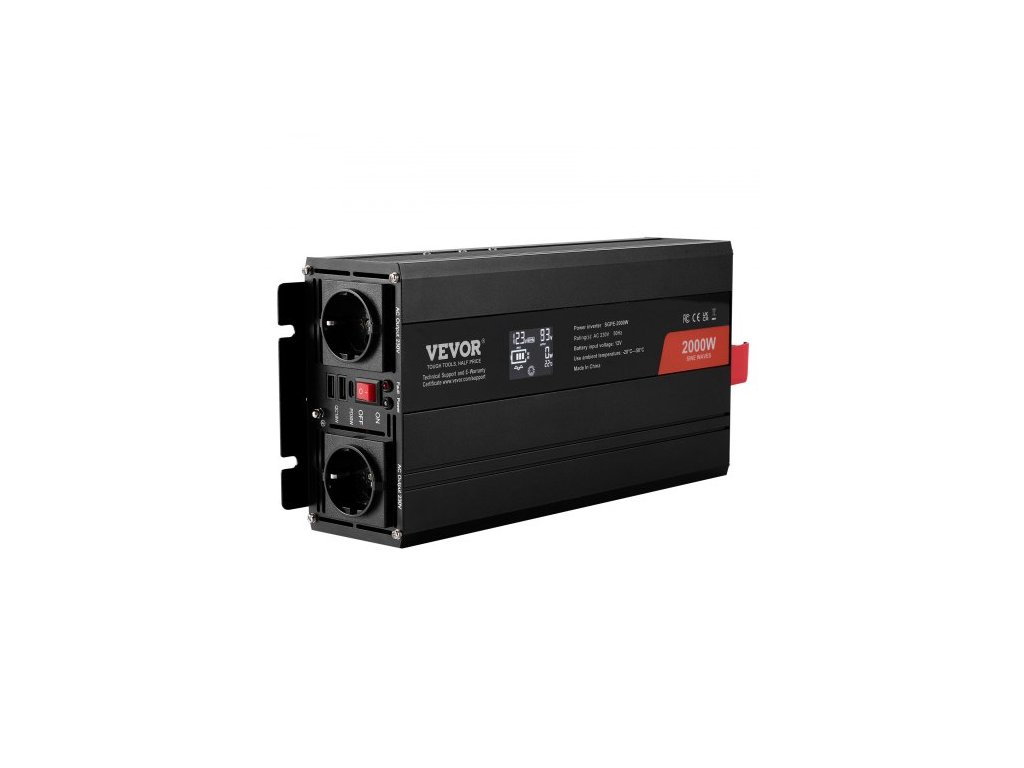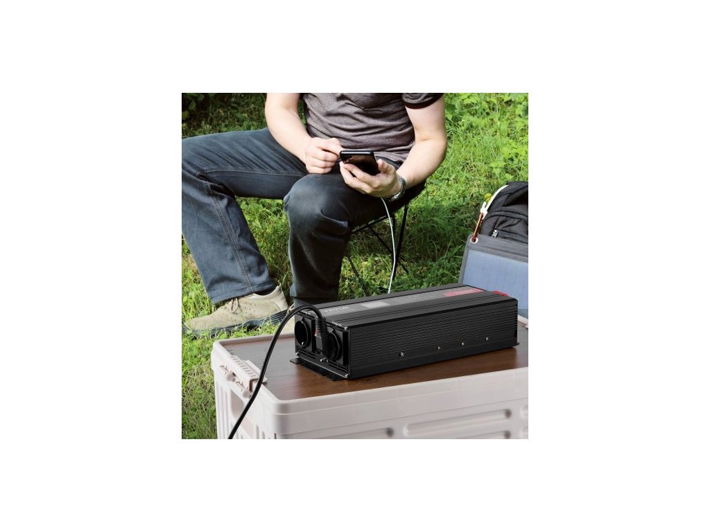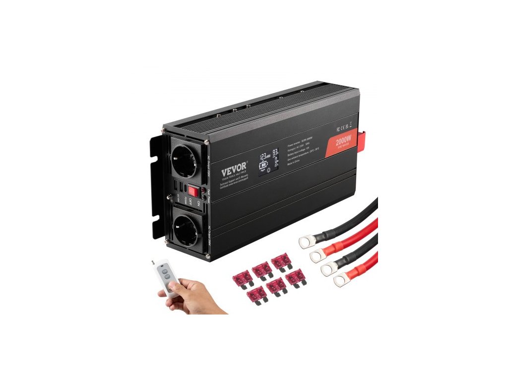 Měnič s čistou sinusovou vlnou, 2000 W, DC 12 V na AC 230 V, se 2 AC zásuvkami, 2 USB porty, 1 portem typu C, LCD displejem a dálkovým ovladačem pro středně velké domácí spotřebiče, CE FCC