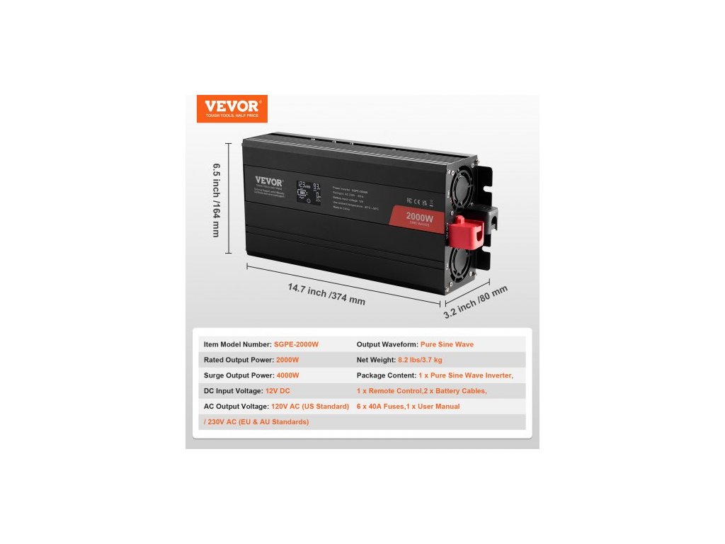 Vstupní napětí DC: 12 V DC, Výstupní napětí AC: 230 V AC, Jmenovitý výstupní výkon: 2000 W, Výstupní přepěťový výkon: 4000 W, Číslo modelu položky: SGPE-2000 W, Rozměry produktu: 12 x 5,7 x 2,8 palce/305 x 144 x 72 mm, Čistá hmotnost: 8,2 lbs/3,7 kg, Výstupní tvar vlny: Čistý Sinusová vlna