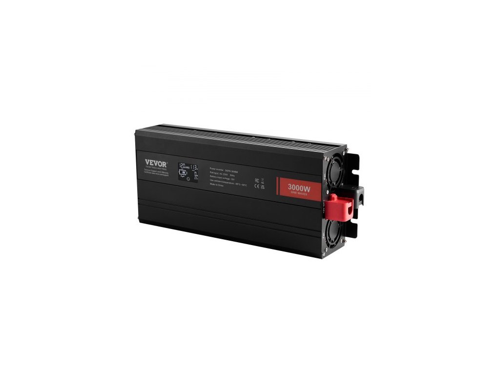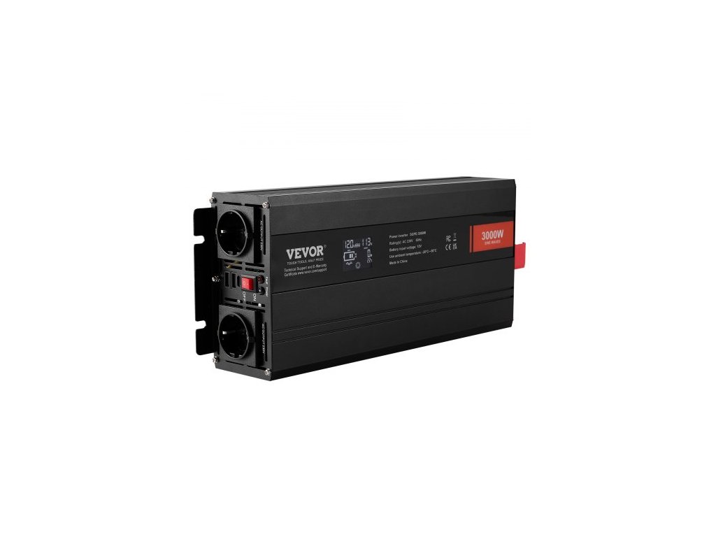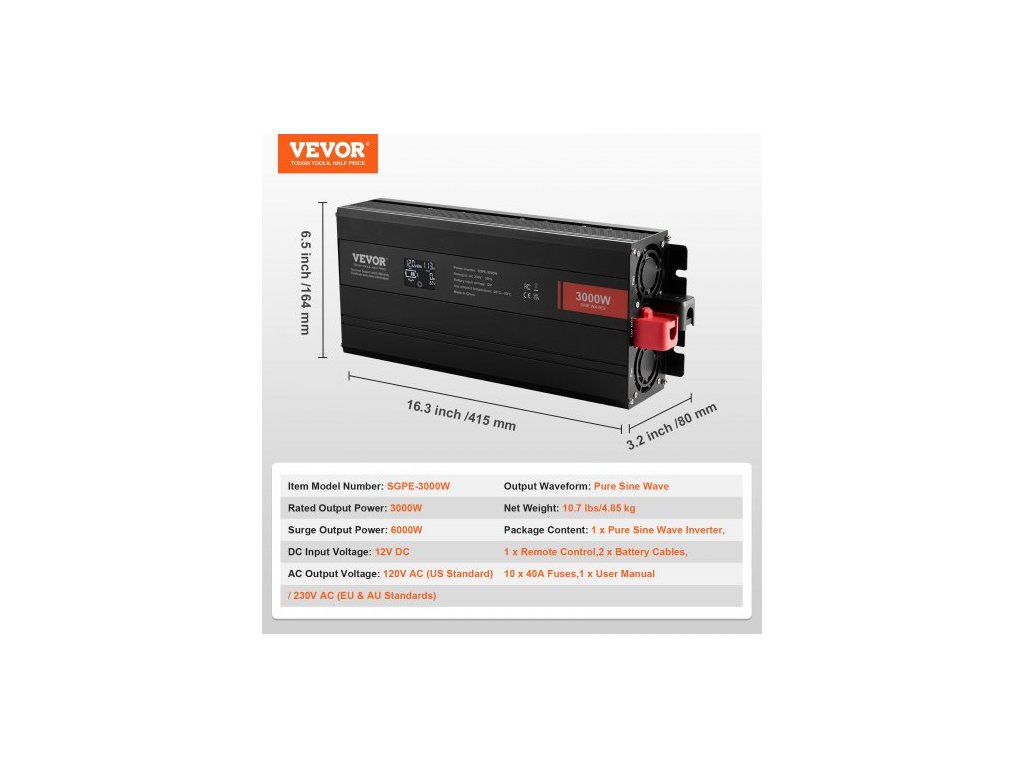 Vstupní napětí DC: 12 V DC, Výstupní napětí AC: 230 V AC, Jmenovitý výstupní výkon: 3000 W, Výstupní přepěťový výkon: 6000 W, Číslo modelu položky: SGPE-3000 W, Rozměry produktu: 415 x 164 x 80 mm, Čistá hmotnost: 4,85 kg, Výstup Tvar vlny: Čistá sinusová vlna