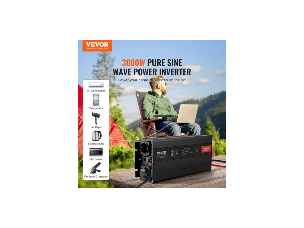 Měnič s čistou sinusovou vlnou, 3000 W, měnič DC 12 V na AC 230 V se 2 AC zásuvkami, 2 USB porty, 1 port typu C, LCD displej a dálkový ovladač pro velké domácí spotřebiče, certifikace CE FCC3000W měnič s čistou sinusovou vlnou